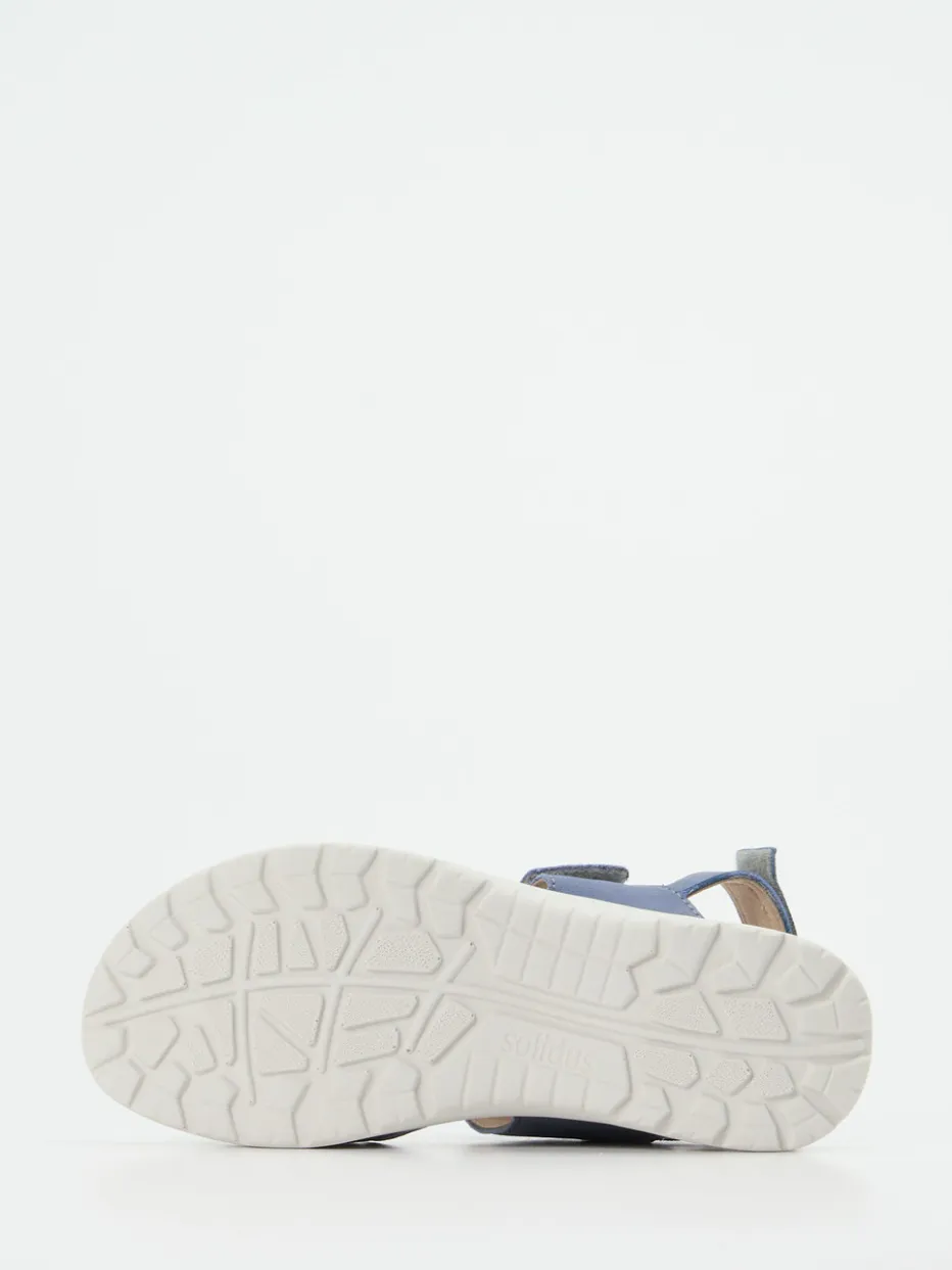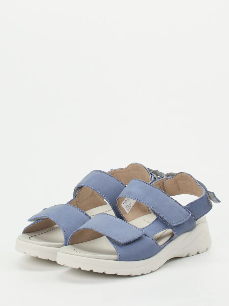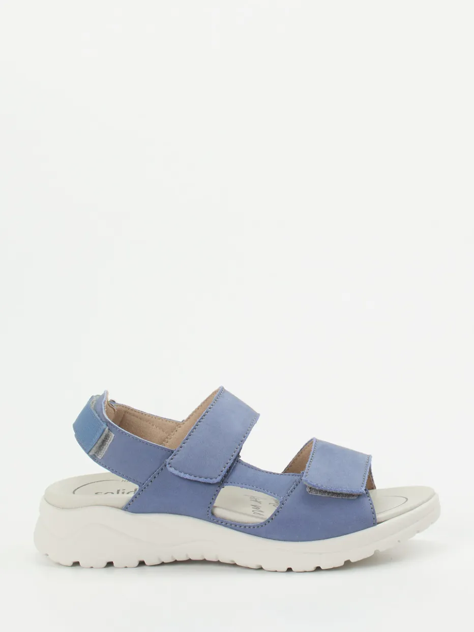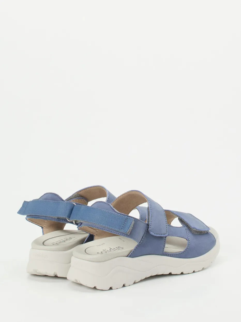 Funktion trifft Komfort – ideal für Alltag und Reise.Solidus präsentiert bequeme Komfortsandalen für Damen. Ob beim Stadtbummel oder auf Reisen – diese Sandalen in jeansblauem Nubukleder bieten mit drei Klettverschlüssen optimalen Halt und eine passgenaue Weitenregulierung. Das samtig angeschliffene Leder und die matte Oberfläche verleihen einen funktional-zurückhaltenden Stil. Die profilierte Gummisohle sorgt für sicheren Tritt, das gepolsterte, ergonomisch geformte Wechselfußbett in Weite H unterstützt mühelos ganztägigen Komfort. Minimalistische Linienführung und Ton-in-Ton-Nähte betonen den relaxed-eleganten Look. Harmonisch zu Caprihosen und luftigen Blusen kombinierbar. Ein durchdachtes Komfortmodell – typisch Solidus Qualität.