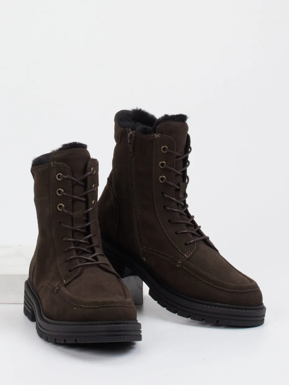 Für kalte Tage mit Stil.Solidus präsentiert klassische Damen-Schnürboots aus hochwertigem Veloursleder. Wenn urbaner Alltag auf winterliche Witterung trifft, sind wärmeisolierende Materialien und sicheres Auftreten entscheidend. Das samtig matte Veloursleder in dunklem Braun wird durch tonale Ziernähte und Metallösen in Antikgold-Optik stilsicher akzentuiert. Innen sorgt ein weiches Wollfutter für angenehme Wärme, während die robuste Gummisohle mit starkem Profil Trittsicherheit bietet. Die Kombination aus Schnürung und seitlichem Reißverschluss vereinfacht den Einstieg. Ideal für minimalistische Winter-Looks im Casual-, Outdoor- oder Komfortbereich. Solide gefertigt für Komfortliebhaberinnen – typisch Solidus.