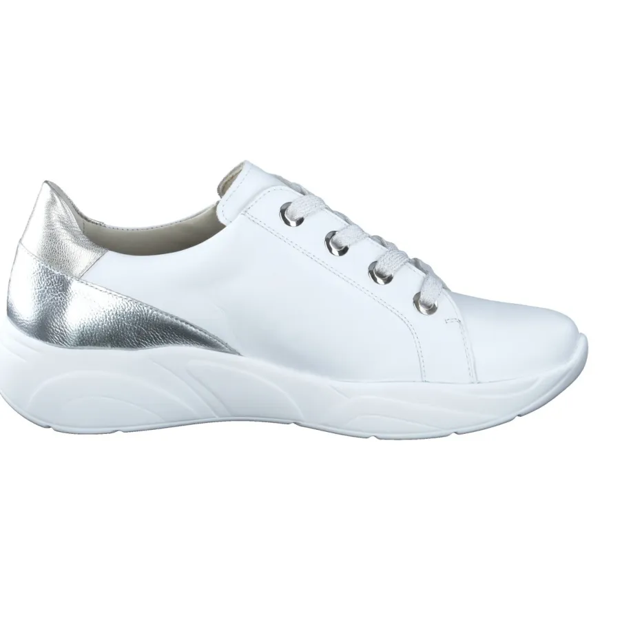 Sportlicher Glanz im Alltag.Der Solidus-Schnürschuh für Damen verbindet Komfort mit moderner Optik. Für entspannte City-Tage oder tägliche Erledigungen bietet das glatte weiße Kalbleder mit silberfarbenen Metallicelementen eine stilvolle Grundlage. Die voluminös-runde Form wird sportiv betont durch glitzernde Schnürsenkel und einen glänzenden Reißverschluss. Die bequeme, lederbezogene Kork-Einlage ist herausnehmbar und macht das Modell einlagengeeignet. Eine weiße Gummisohle mit leichter Erhöhung sorgt für sicheren Auftritt. Silbergraue Akzente harmonieren ideal zu weißen Jeans oder minimalistischen Streetwear-Looks. Solidus steht hier für hochwertige Verarbeitung und passgenaue Wohlfühl-Weite K.