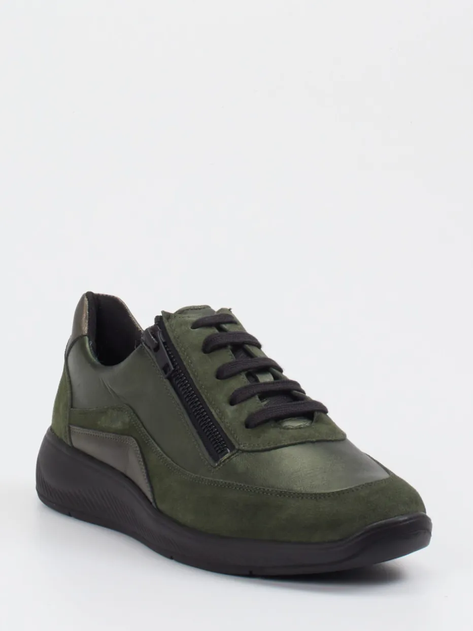 Stilvoll durch den Alltag mit Komfort.Solidus präsentiert diesen Sneaker für Herren als sportive Low-Top-Variante im alltagstauglichen Design. Ideal für komfortorientierte Freizeitlooks zeigt sich das Modell in olivgrünem Glattleder mit samtig angeschliffenen Veloursleder-Elementen. Die sportlich-flache Silhouette wird von einer flexiblen Gummisohle und einem seitlichen Reißverschluss ergänzt. Dezente Ton-in-Ton-Nähte und Metallic-Details an der Ferse betonen den minimalistischen Streetwear-Charakter. Das weiche Innenfutter aus Leder und Textil sorgt für angenehmen Tragekomfort – auch für Einlagen geeignet. Perfekt kombinierbar mit urbanen Essentials wie Softshelljacke oder Casual-Rucksack. Solide Passform und smartes Design – ein Bequemschuh mit Anspruch von Solidus.