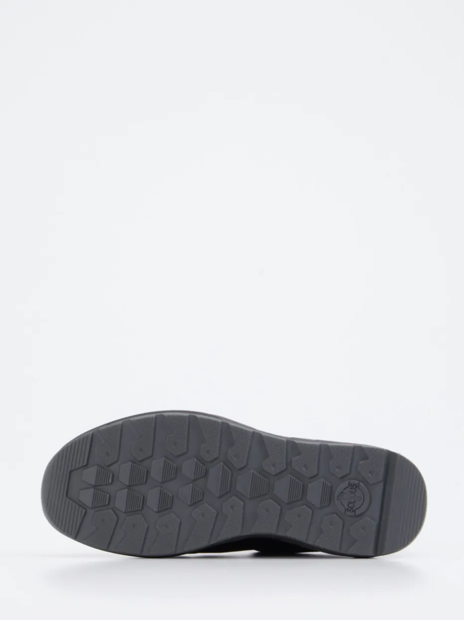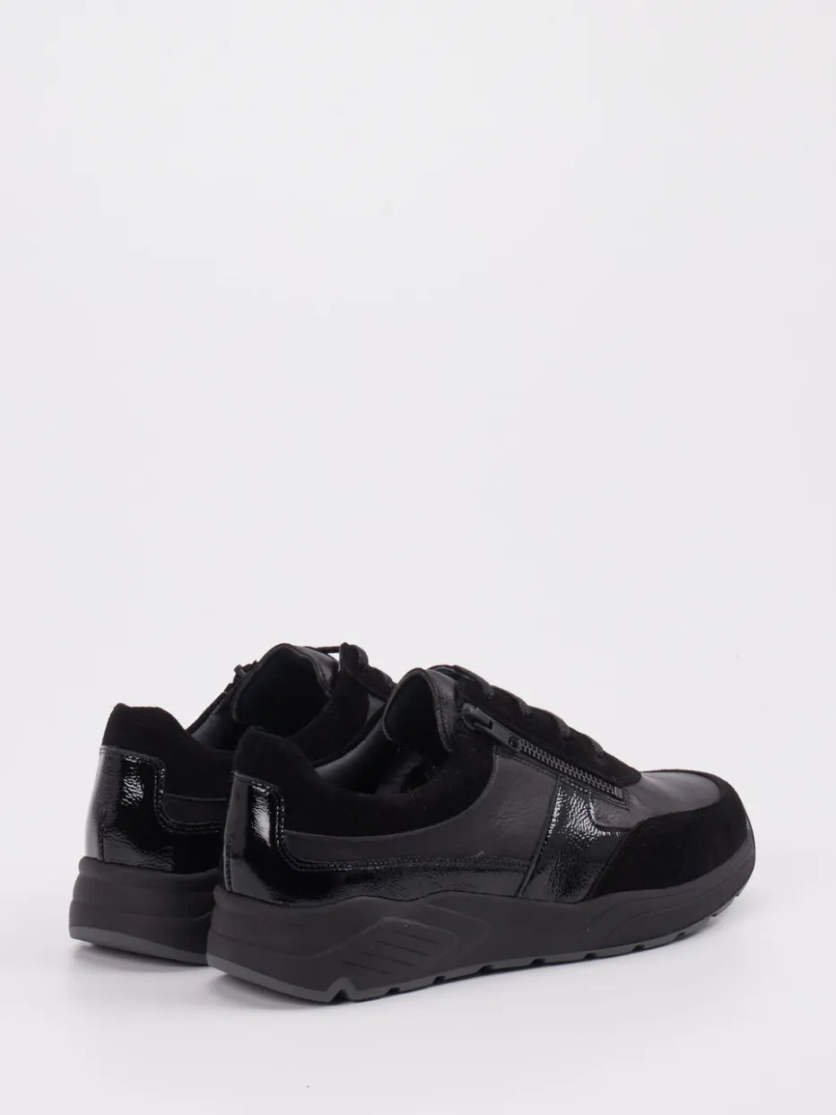 Schwarz neu interpretiert.Solidus präsentiert einen Damen-Sneaker, der klassische Zurückhaltung mit urbaner Raffinesse kombiniert. Ideal für Tage mit wechselnden Anforderungen überzeugt dieser Low-Top durch einen fein abgestimmten Materialmix aus Velour- und Glattleder, ergänzt um glänzende Lackakzente. Die schwarze Farbgebung wirkt edel und minimalistisch. Mit abgerundeter Silhouette, seitlichem Reißverschluss und profilierter Gummisohle legt das Modell den Fokus auf Tragekomfort und Funktion. Details wie Ton-in-Ton-Design und cleane Linien verankern ihn stilistisch im All-Black-Trend der Saison Herbst/Winter. Solidus steht für durchdachten Komfort mit klarer Formsprache – hochwertig, modern, alltagstauglich.