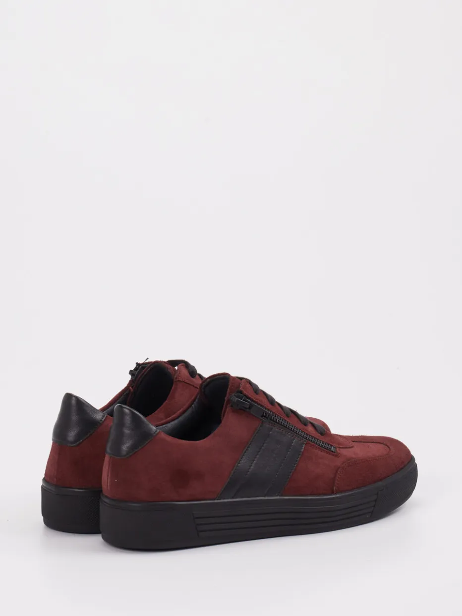 Dieser komfortable Herren-Sneaker verbindet bordeauxrotes Veloursleder mit minimalistischer Linienführung und funktionalen Details wie dem seitlichen Reißverschluss.