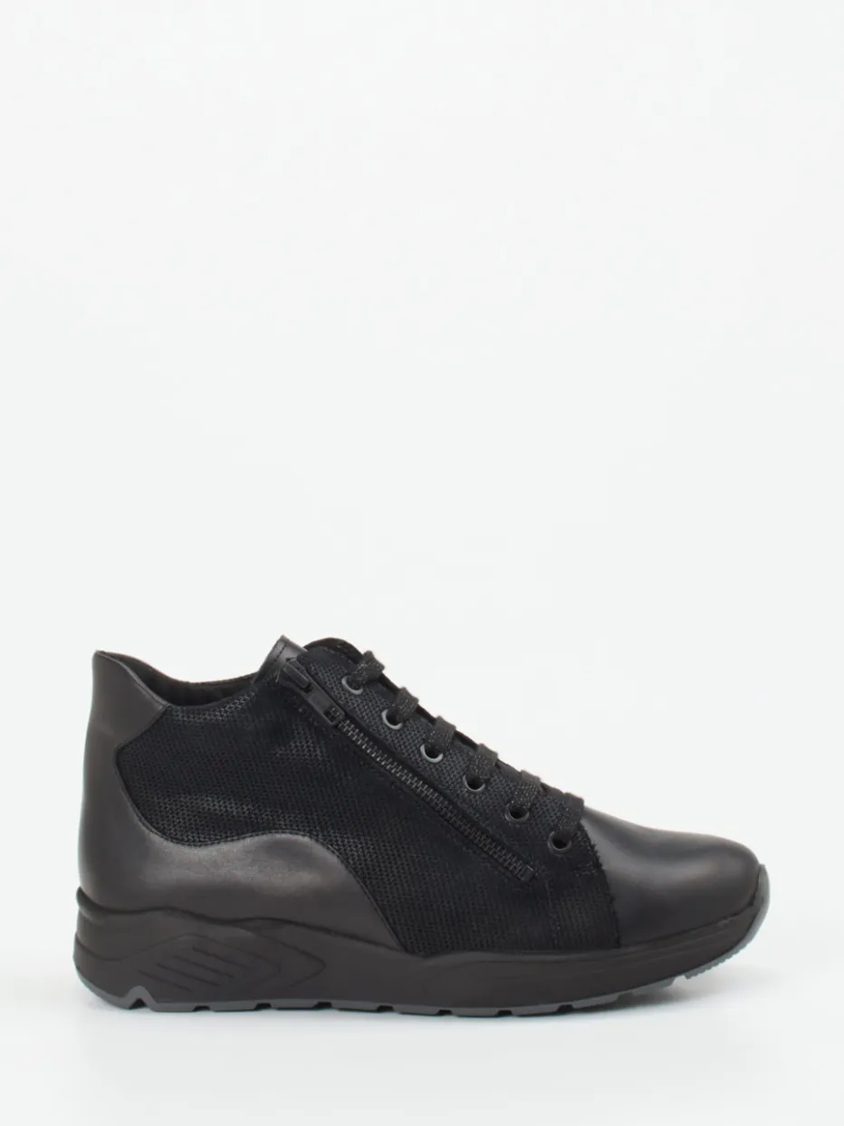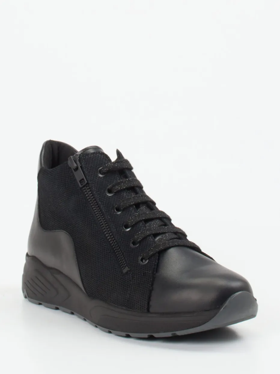 Ideal für den Alltag bietet dieses Modell mit geprägtem Leder, glatten Partien und strukturiertem Mesh einen ausbalancierten Materialmix. Akzentuiert wird das schwarze Design durch tonale Reißverschlüsse und glitzernde Schnürsenkel. Die Gummisohle mit rutschfester Struktur unterstützt eine natürliche Abrollbewegung, während das wollgefütterte Innere Wärme und Bequemlichkeit garantiert. Dank Reißverschluss ist der Einstieg besonders einfach. Perfekt kombinierbar mit urbanen Relax-Looks oder schlichten Freizeit-Outfits.