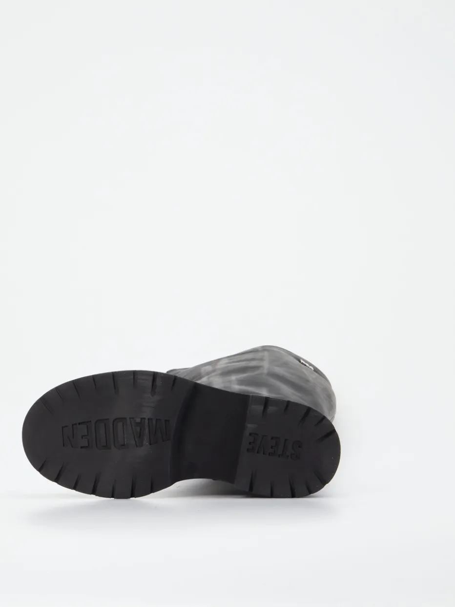 Klare Linien für stilbewusste Auftritte.Die Marke Steve Madden präsentiert kniehohe Damenstiefel in geradliniger Silhouette für Urban Streetlooks mit Anspruch. Gefertigt aus hochwertigem Glattleder mit matter Oberfläche überzeugt das Modell in klassischem Schwarz mit minimalistischem Design. Die markante Chunky-Profilsohle sowie ein schmaler Reißverschluss unterstreichen den funktionalen Trendcharakter. Optische Details wie das seitliche metallische SM-Logo und die dezente Zuglasche hinten runden das Gesamtbild ab. Eine ideale Wahl für Freizeit und Ausgehen – kombinationsstark zu Kleidern oder Skinny Jeans. Steve Madden steht für stilsicheren Auftritt mit modischer Attitüde.