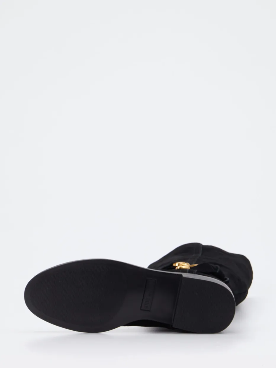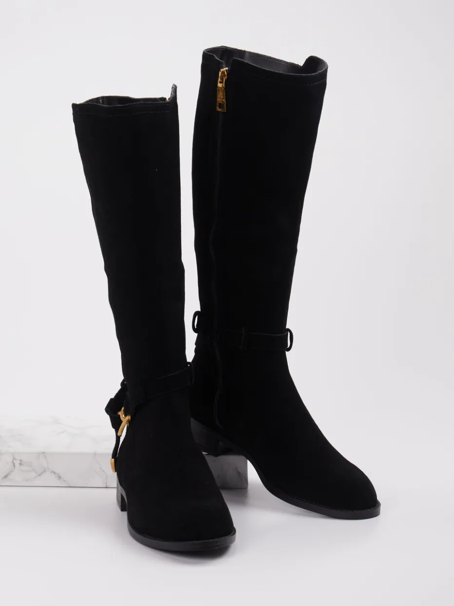 Diese kniehohen Damenstiefel vereinen klassisch-elegantes Design mit minimalistischer Reitstiefel-Anmutung und setzen durch goldfarbene Details stilvolle Akzente.