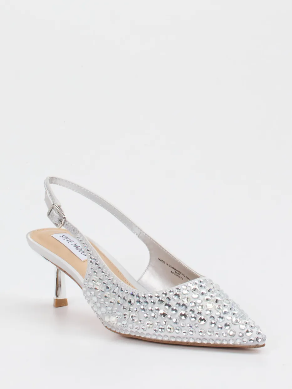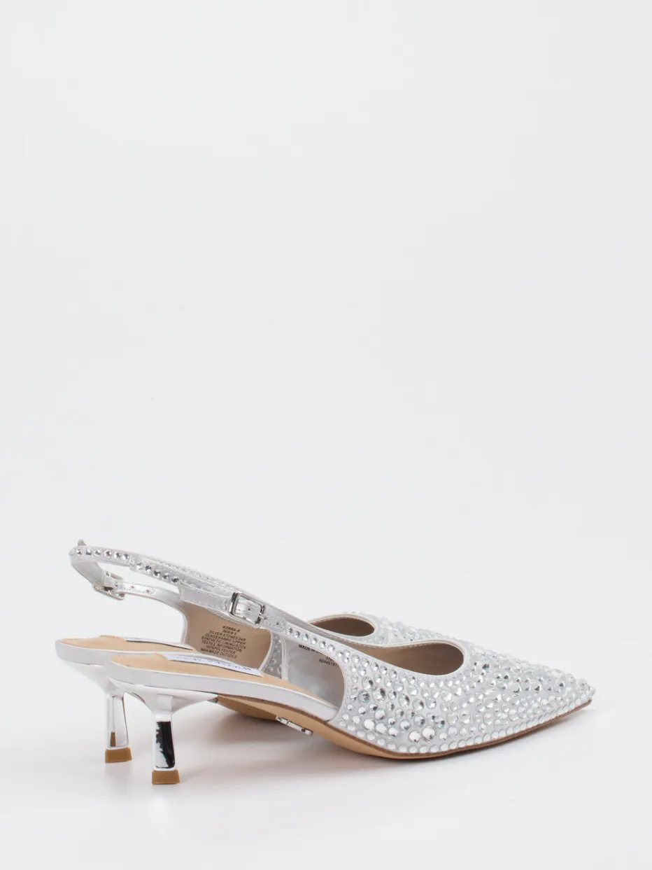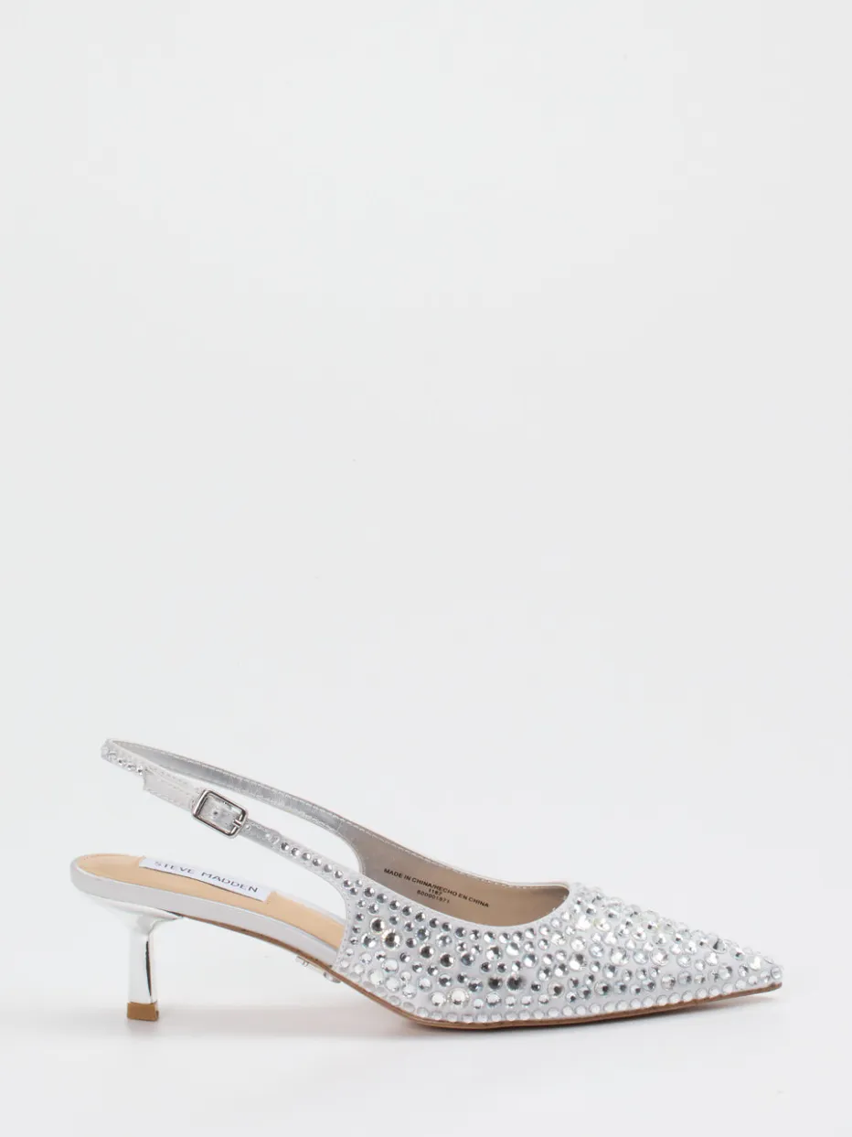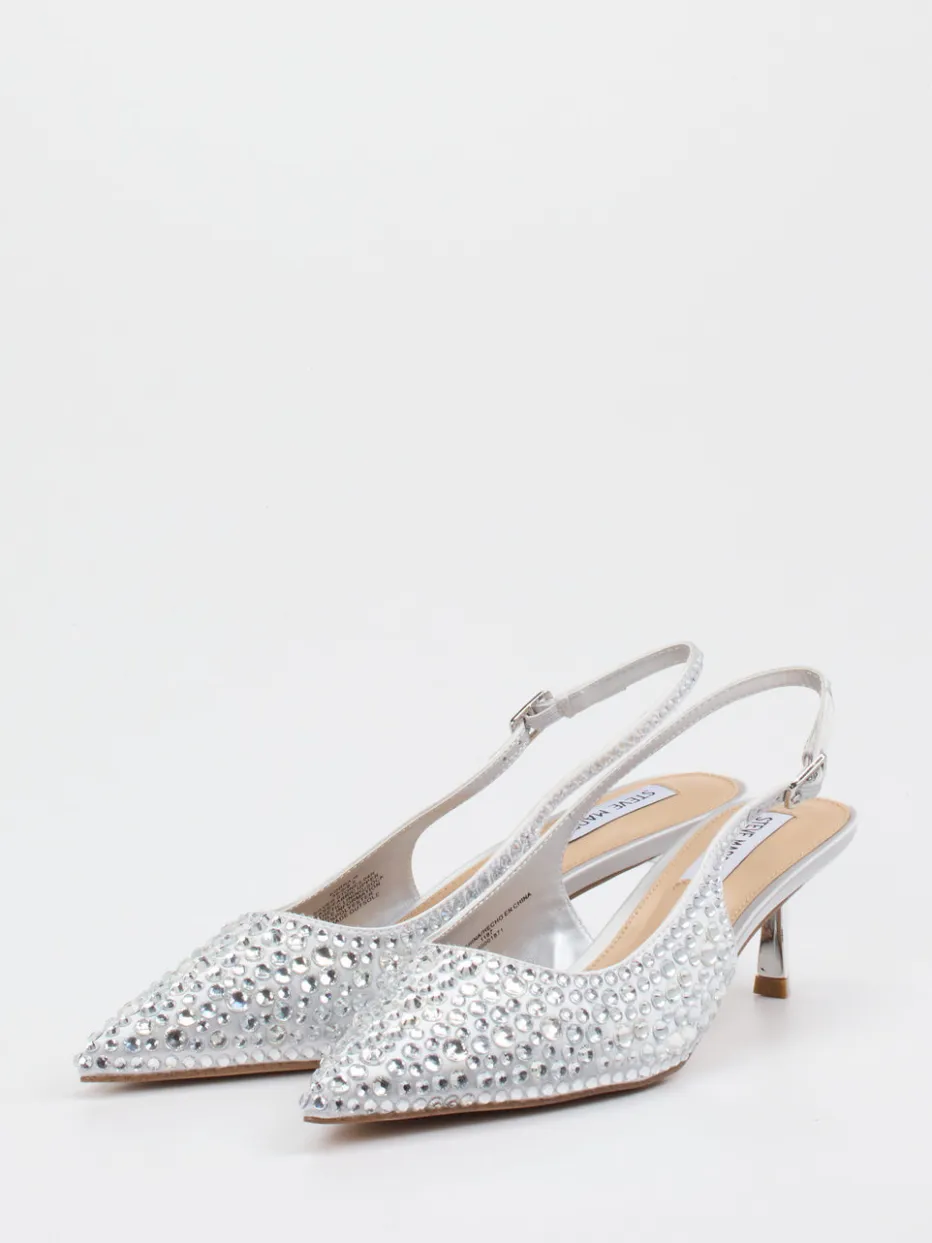Funkelndes Finish für starke Auftritte.Steve Madden präsentiert elegante Damen-Slingback-Pumps mit edlem Metallic-Look. Ob glanzvoller Galaabend oder Partynacht – dieser Schuh setzt ein stilsicheres Statement. Das silberfarbene, glänzende Synthetikmaterial wird von einem opulenten Strassbesatz akzentuiert. Die spitz zulaufende Form und der zierliche Kitten Heel unterstreichen die glamouröse Silhouette, während der verstellbare Fersenriemen sicheren Halt gibt. Die Gummisohle sorgt dabei für angenehmen Gehkomfort. Inspiriert vom Y2K-Trend, ist dieses Modell ideal für modische Akzente. Ein stilvoller Eyecatcher mit markentypischem Trendgespür von Steve Madden.