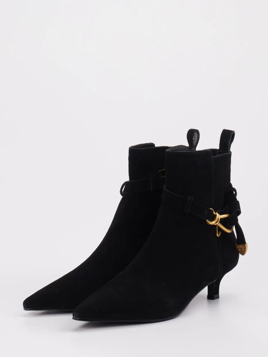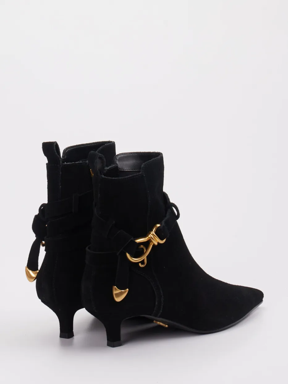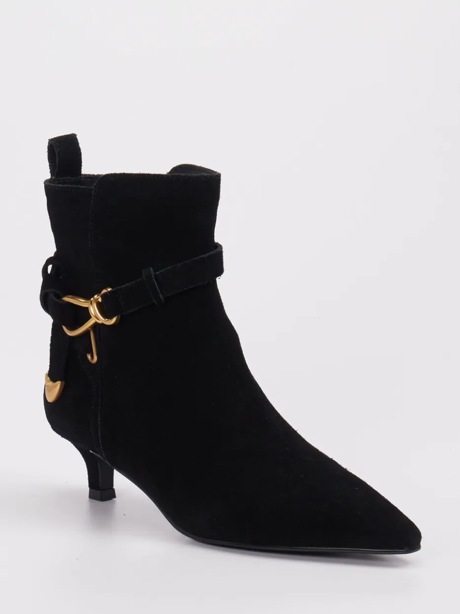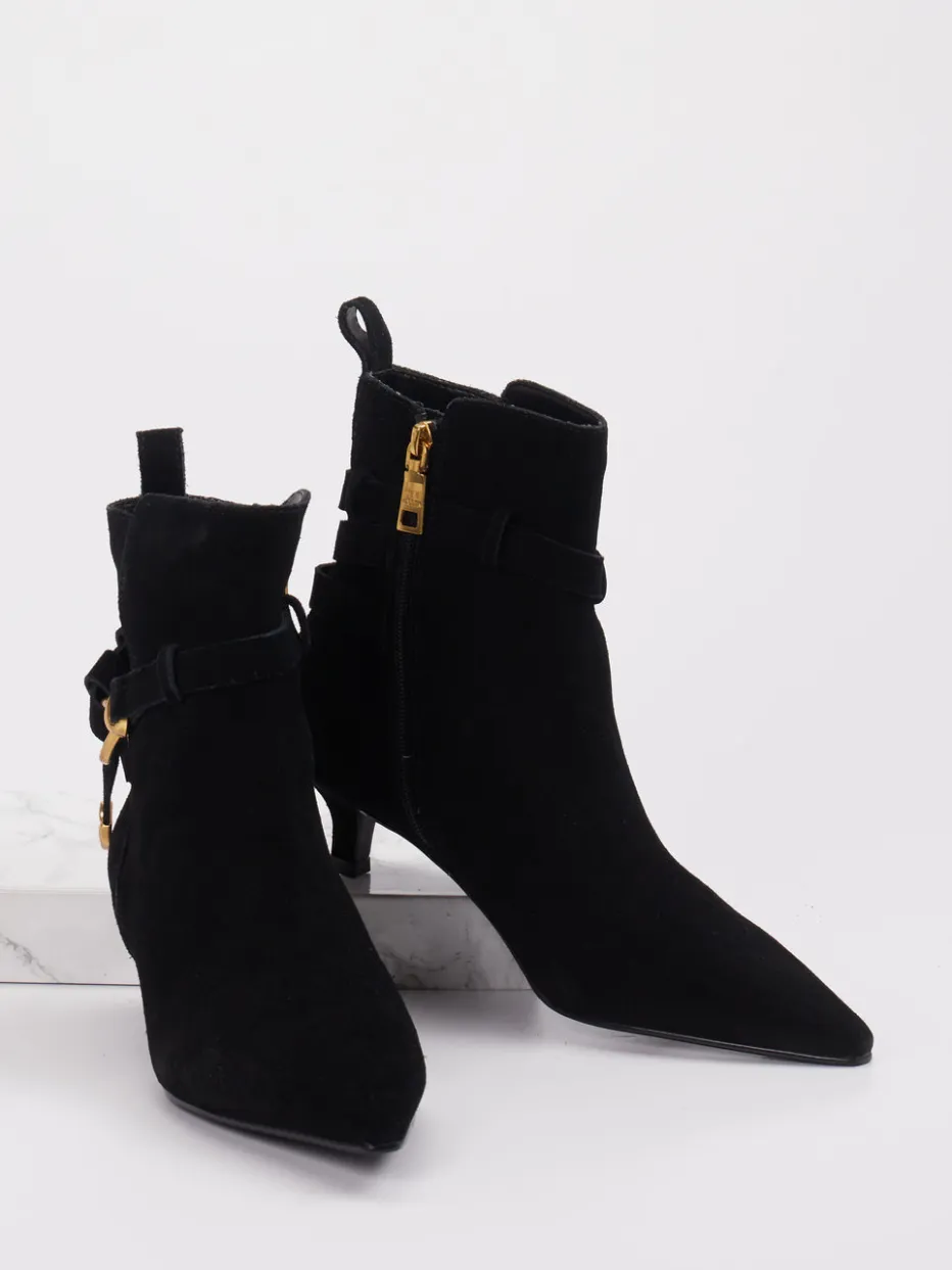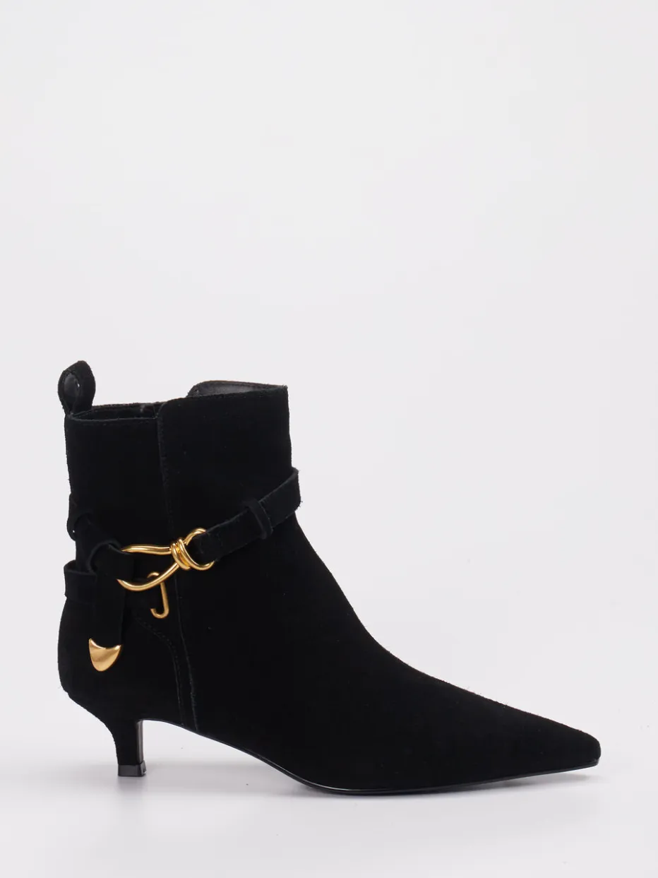 Schwarzes Veloursleder mit matter Oberfläche und goldfarbener Schnalle verleiht dem Modell eine hochwertige, zurückhaltende Ausstrahlung – inspiriert vom Quiet-Luxury-Trend. Die spitz zulaufende Front, ein integrierter Reißverschluss in Gold und eine dezente Zuglasche auf der Rückseite unterstreichen die minimalistische Formsprache. Die Gummisohle sorgt für dezenten Komfort im Alltag. Perfekt kombinierbar mit einer schmal geschnittenen Hose oder einem Kleid mit klarer Silhouette.