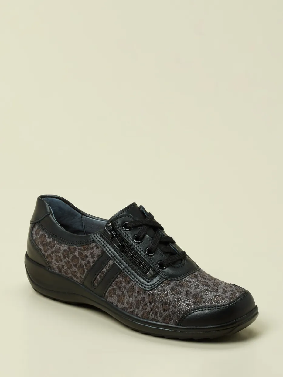 Modischer Komfort für entspannte Tage.Die Marke Stuppy liefert mit diesem Komfort-Sneaker eine durchdachte Begleitung für alltagstaugliche Outfits. Dank mattem Kalbleder kombiniert mit stretchigem Textil in Animalprint zeigt das Modell einen anpassungsfähigen Materialmix, der Stabilität und Flexibilität schafft. Der anthrazitfarbene Look mit dunkelbraunen Akzenten wird durch Ton-in-Ton-Nähte und zwei seitliche Reißverschlüsse verfeinert. Die ergonomisch geformte Reflexor-Sohle sorgt für Trittsicherheit und angenehme Dämpfung, ideal bei längeren Wegen. Schnürung und Reißverschlüsse bieten schnellen Einstieg und variable Passform. Verlässlicher Tragekomfort mit stilsicherer Note – typisch Stuppy.