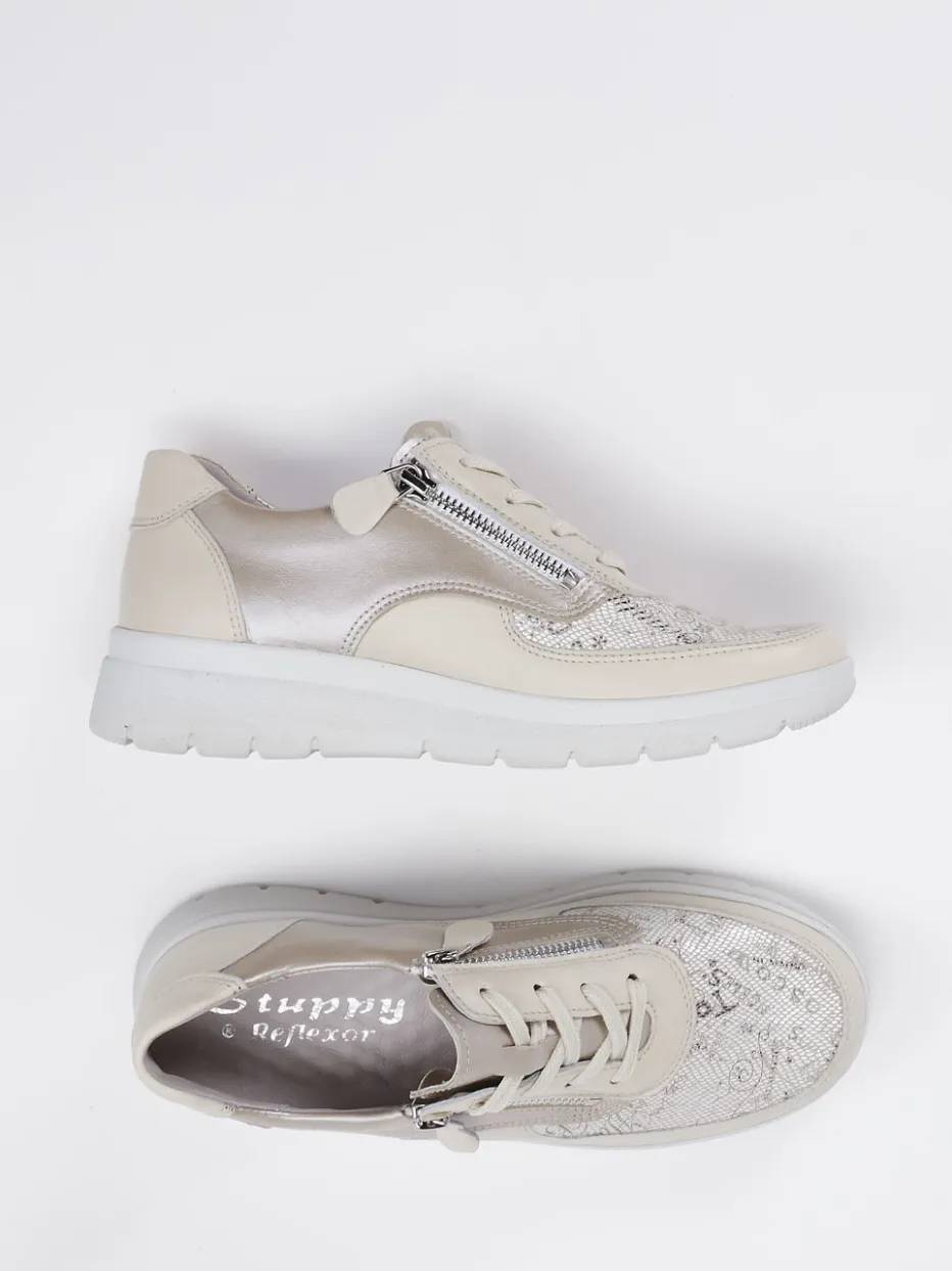 Bequem trifft dezent schimmernd.Stuppy bietet mit diesem Komfort-Sneaker ein Modell für den entspannten Alltag. Ideal für längere Strecken oder den Stadtbummel: Das cremefarbene, bedruckte Stretchleder verhindert Druckstellen, ergänzt durch glänzendes Metallicleder in Champagnertönen. Die ergonomische Form mit gepolstertem Schaftrand, seitlichen Reißverschlüssen und der Weite H verspricht höchsten Komfort. Die leichte PU-Sohle ist flexibel und rutschhemmend, das Reflexor-Massagefußbett herausnehmbar. Der Schriftprint und sanfte Glanz verleihen eine moderne Note im Casual-Design. Ein Alltagsbegleiter mit funktionaler Raffinesse und dezenter Eleganz.
