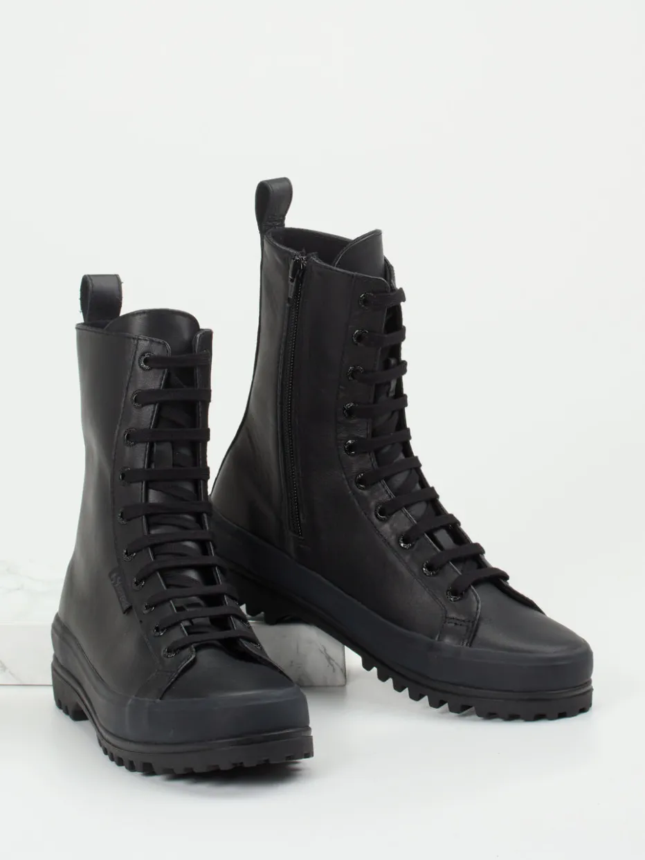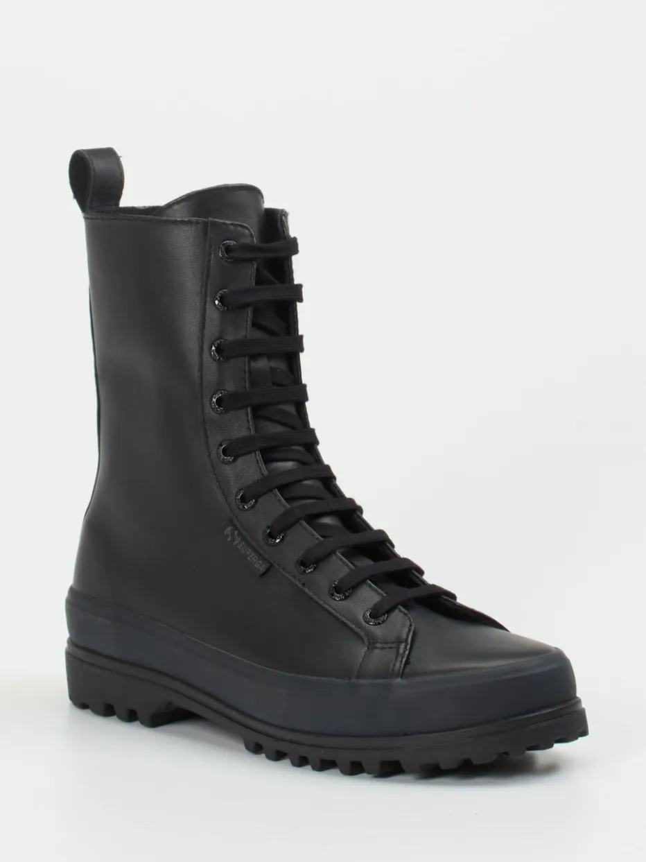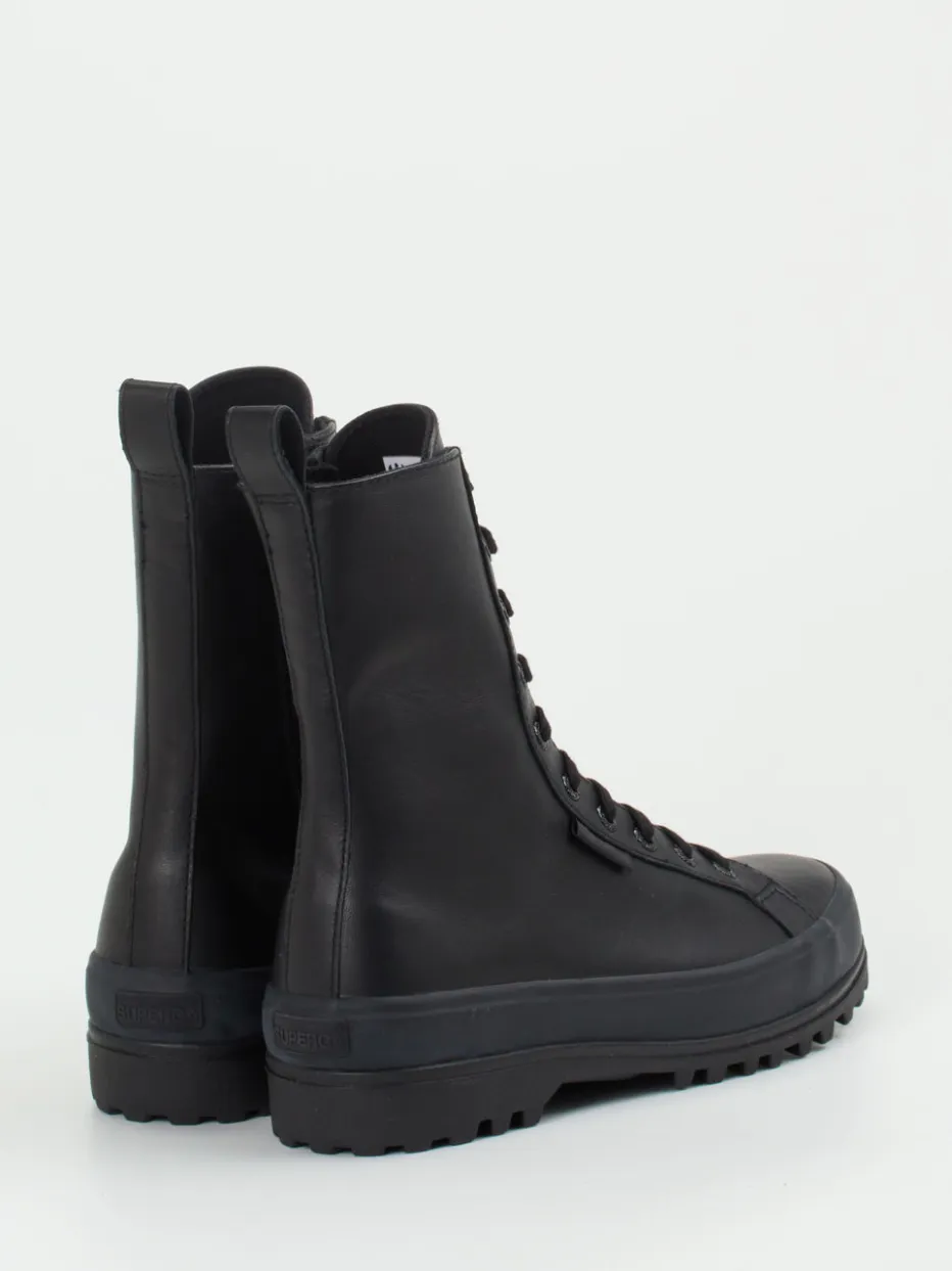Minimalismus trifft Funktionalität.Die Marke Superga präsentiert robuste Schnürboots für die kühle Jahreszeit. Für festen Halt bei Wind und Wetter sorgen schwarzes Kalbleder mit matter Oberfläche und eine griffige, vulkanisierte Gummisohle. Die geradlinige Silhouette wird durch eine Ton-in-Ton-Schnürung und ein zurückhaltendes Branding an der Seite unterstrichen. Ein seitlicher Reißverschluss sowie eine praktische Zuglasche hinten erleichtern den Einstieg. Die Boots sind stilistisch inspiriert von Utility- und Streetwear-Ästhetiken, wodurch sie sich mühelos zu monochromen Looks mit Oversized-Parka und Strickaccessoires kombinieren lassen. Ein kompromissloser City-Boot mit modischer Outdoor-DNA von Superga.