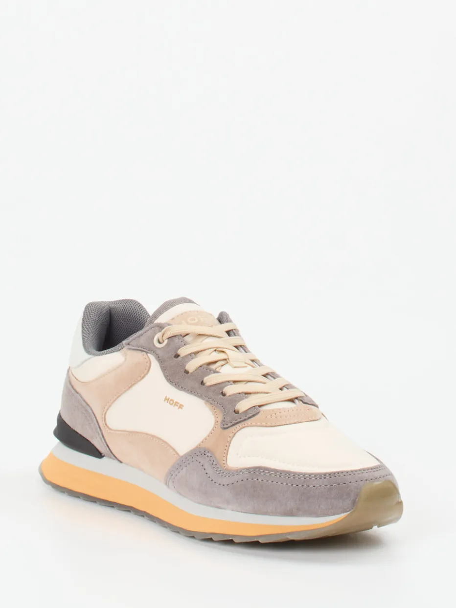 Optisches Highlight mit urbanem Charakter.THE HOFF BRAND verbindet Retro-Flair mit modernem Design in dieser Sneaker-Kreation. Ideal für entspannte Tage in der City: Der Retro-Sneaker kombiniert samtig angeschliffenes Veloursleder mit leichtem Textil und Glattlederimitat. Die cremebeige Grundfarbe wirkt mit Akzenten in Taupe und Sand besonders harmonisch. Stilprägend sind die klassische flache Silhouette, die helle Schnürung und die transparente Außensohle mit Stadtgrafik „PUEBLA“. Polsterung am Schaft sorgt für Komfort im Alltag. Inspiriert von Streetwear und dem 90s-Revival passt das Modell zu Jogpants und Oversize-Hoodies. Trendorientierter Look mit dynamischer Markenidentität.