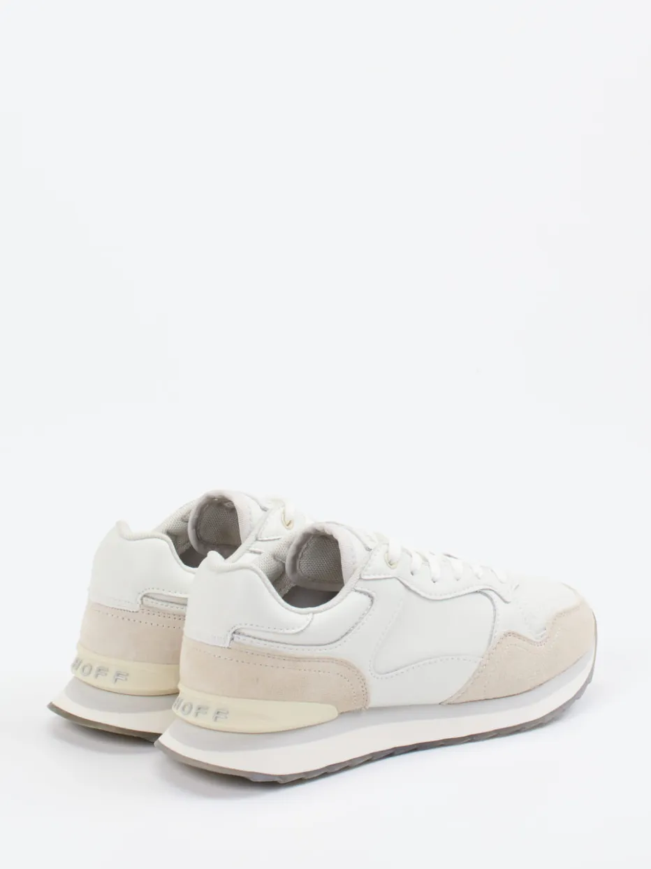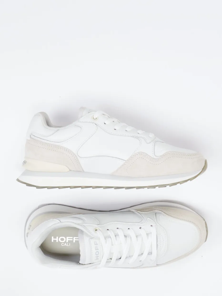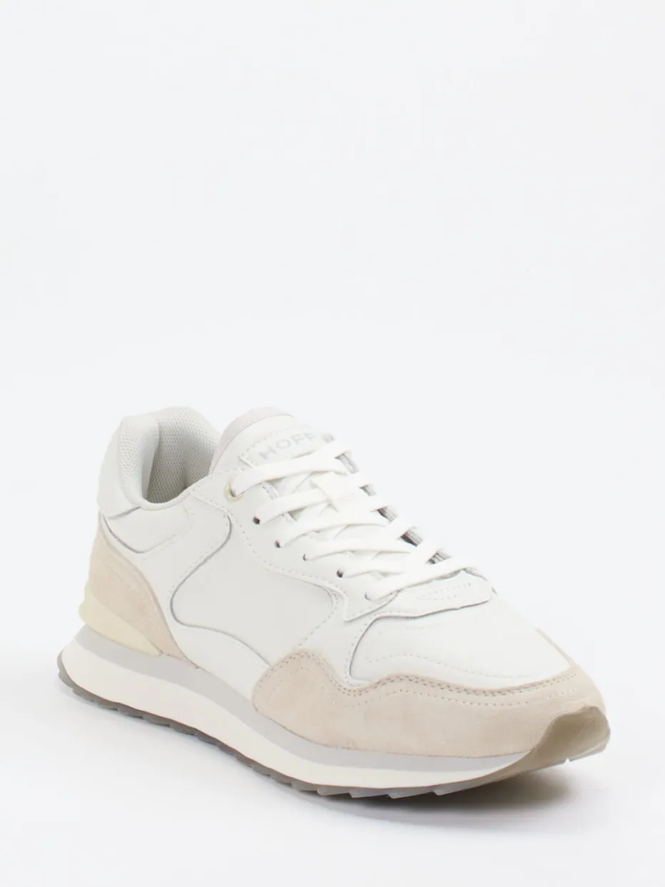 Retro-Klassiker mit modernem Flair.THE HOFF BRAND bringt mit diesem Sneaker ein Unisex-Modell für die Städte-Edition. Der Sneaker vereint weiches weißes Lammleder mit samtig angeschliffenem grauem Veloursleder. Die klassische Runner-Silhouette in Offwhite wird durch tonige Nähte, einen gepolsterten Schaftrand und die markante Printsohle optisch aufgewertet. Schnürung und transparenter Gummi sorgen für sicheren Halt, während das herausnehmbare Schaumstofffußbett Tragekomfort garantiert. Die zurückhaltende Farbigkeit greift perfekt den Quiet-Luxury-Trend auf. Ideal zu Beigetönen oder Oversized-Looks kombinierbar. Ein detailverliebter Sneaker mit dezentem Statement und urbanem Charakter von HOFF.