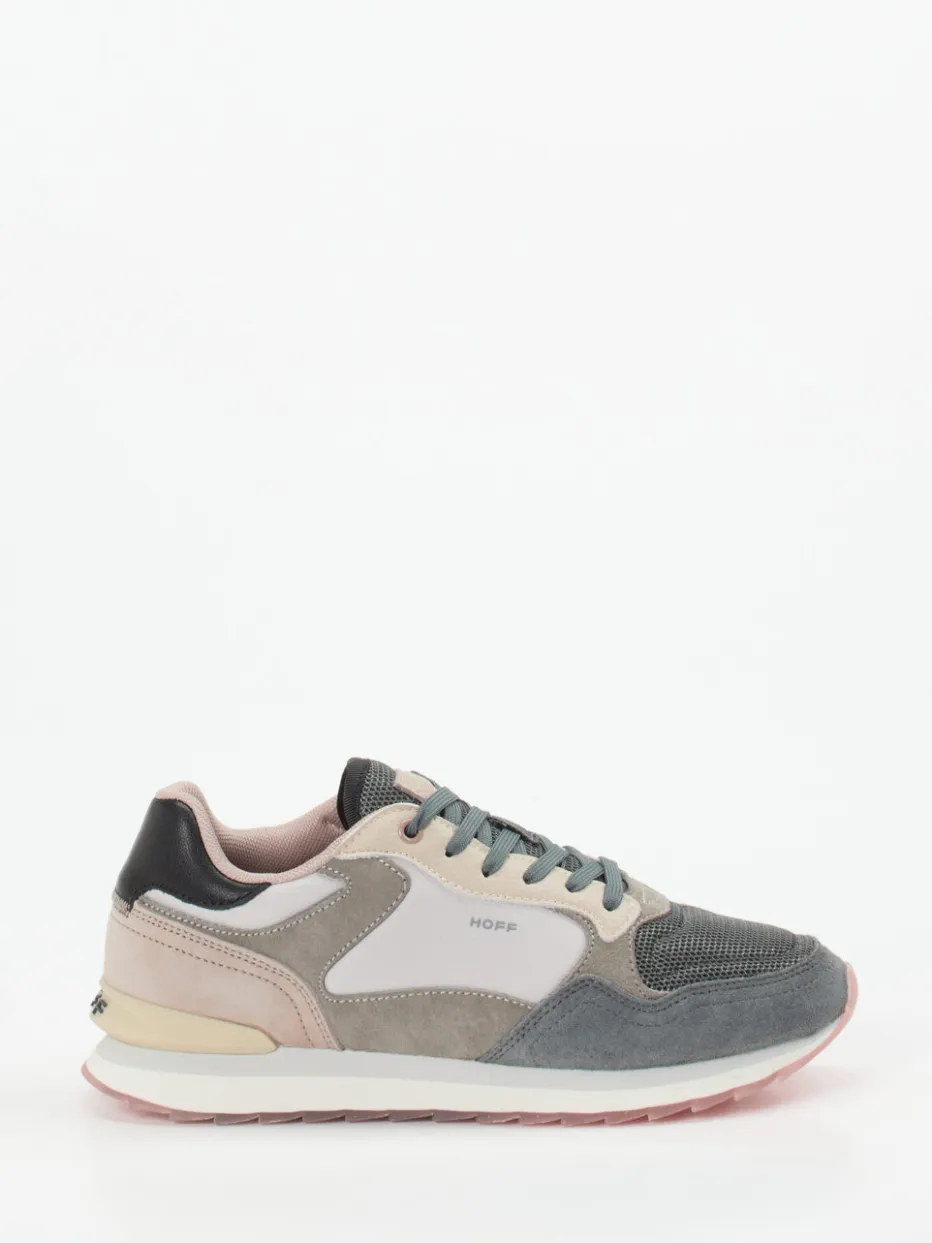 City-Vibes mit subtiler Note.THE HOFF BRAND präsentiert einen trendbewussten Sneaker für Damen und Herren in markanter Retro Runner-Silhouette. Ideal für City-Ausflüge oder entspanntere Alltagsmomente verbindet dieses Modell einen Materialmix aus Velour/Textil mit strukturierter Mesh-Optik und glatten Partien. Pastellige Töne in Taupe-Rosa, Blassrosa und Anthrazit verleihen dem Design Modernität. Die markant profilierte Gummisohle mit transparenter Stadtillustration unterstreicht die urbane Inspiration. Schnürung, gepolsterter Schaftrand und auswechselbares Soft-Fußbett sichern Komfort. Der Style passt besonders gut zu lässigen Bomberjacken und monochromen Outfits. Leicht, charakterstark und modisch durchdacht – ein Sneaker mit Persönlichkeit.