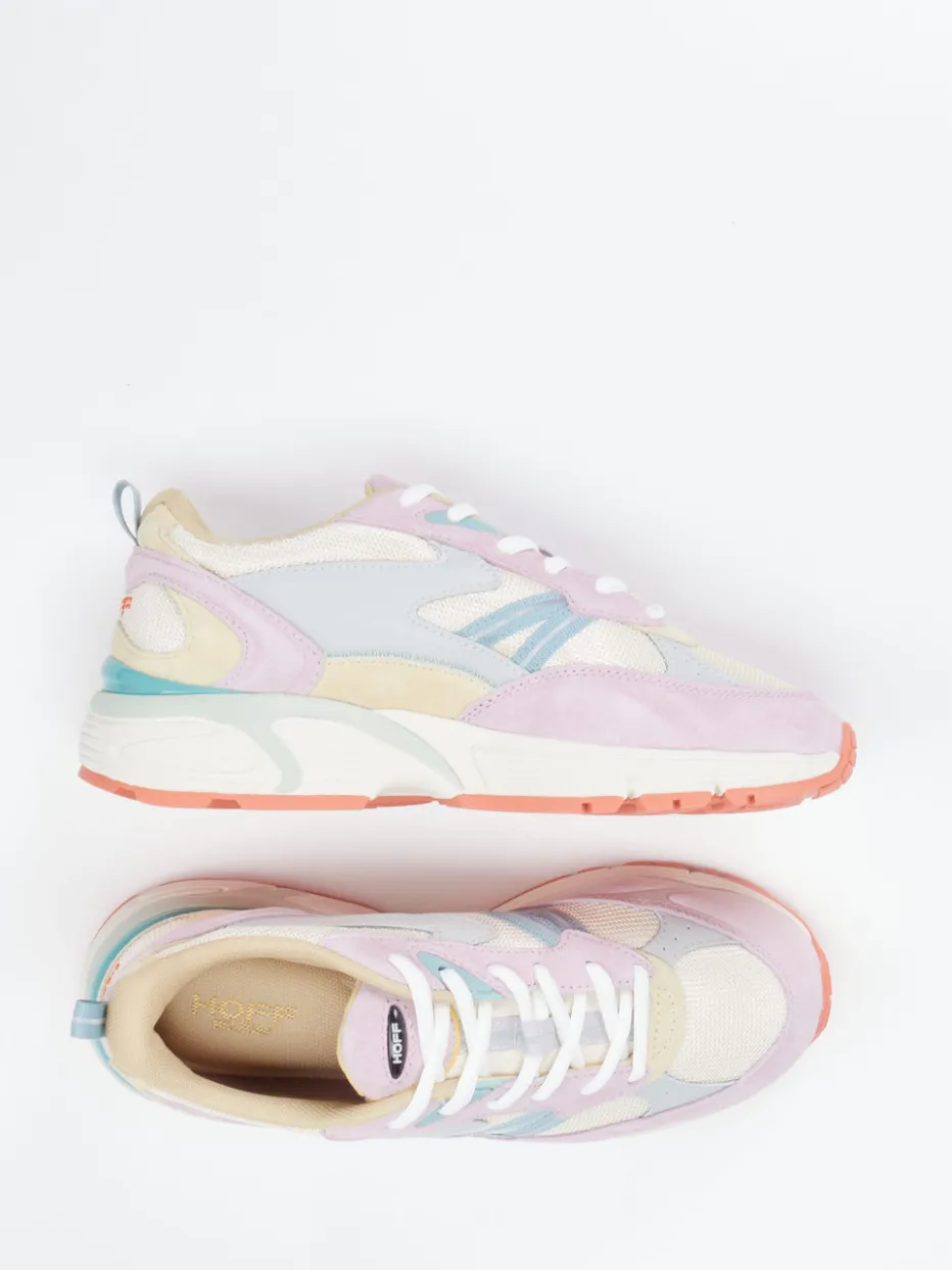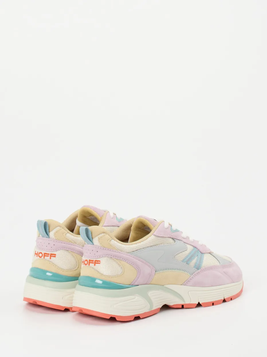 Stilvoll am Puls der Pastellwelt.THE HOFF BRAND präsentiert einen Sneaker, der modische Progressivität mit Alltagstauglichkeit vereint. Ideal für City-Streifzüge oder entspannte Urlaubstage, besticht dieses Modell durch atmungsaktives Mesh und samtig angeschliffenes Veloursleder. Flieder- und Koralltöne ergänzen die cremebeige Grundfarbe, während farblich abgesetzte Overlays, eine charakteristische Zuglasche hinten und eine markant profilierte Gummisohle im Chunky-Look ein Statement setzen. Die retro-inspirierte Silhouette trifft den Y2K-Streetwear-Trend und ergänzt moderne Freizeitgarderoben. Besonders harmonisch wirkt der Sneaker zu farblich abgestimmten Socken oder einer fliederfarbenen Crossbody-Bag. Hoff steht hier für designorientierte Leichtigkeit mit hohem Tragekomfort.