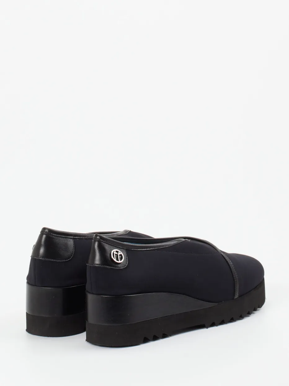 Understatement mit Profil.Thierry Rabotin steht für durchdachtes Schuhdesign – so wie bei diesen stilvollen Damen-Keilpumps. Ob im Büro oder bei urbanen Erledigungen: Das tiefschwarze Textilmaterial mit matter Oberfläche wirkt klar und wertig. Der Keilabsatz mit 5 cm Höhe und markanter Zahnprofilsohle sorgt für komfortable Stabilität. Ton-in-Ton-Paspelierung und ein dezentes Logo-Detail am Fersenbereich unterstreichen den minimalistischen Look. Das türkisfarbene Innenfutter aus Lammnappa setzt einen feinen Akzent. Modisch sind diese Pumps inspiriert von Quiet Luxury und Streetwear. Zeitlos-modern mit typischer Thierry-Rabotin-Leichtfüßigkeit.