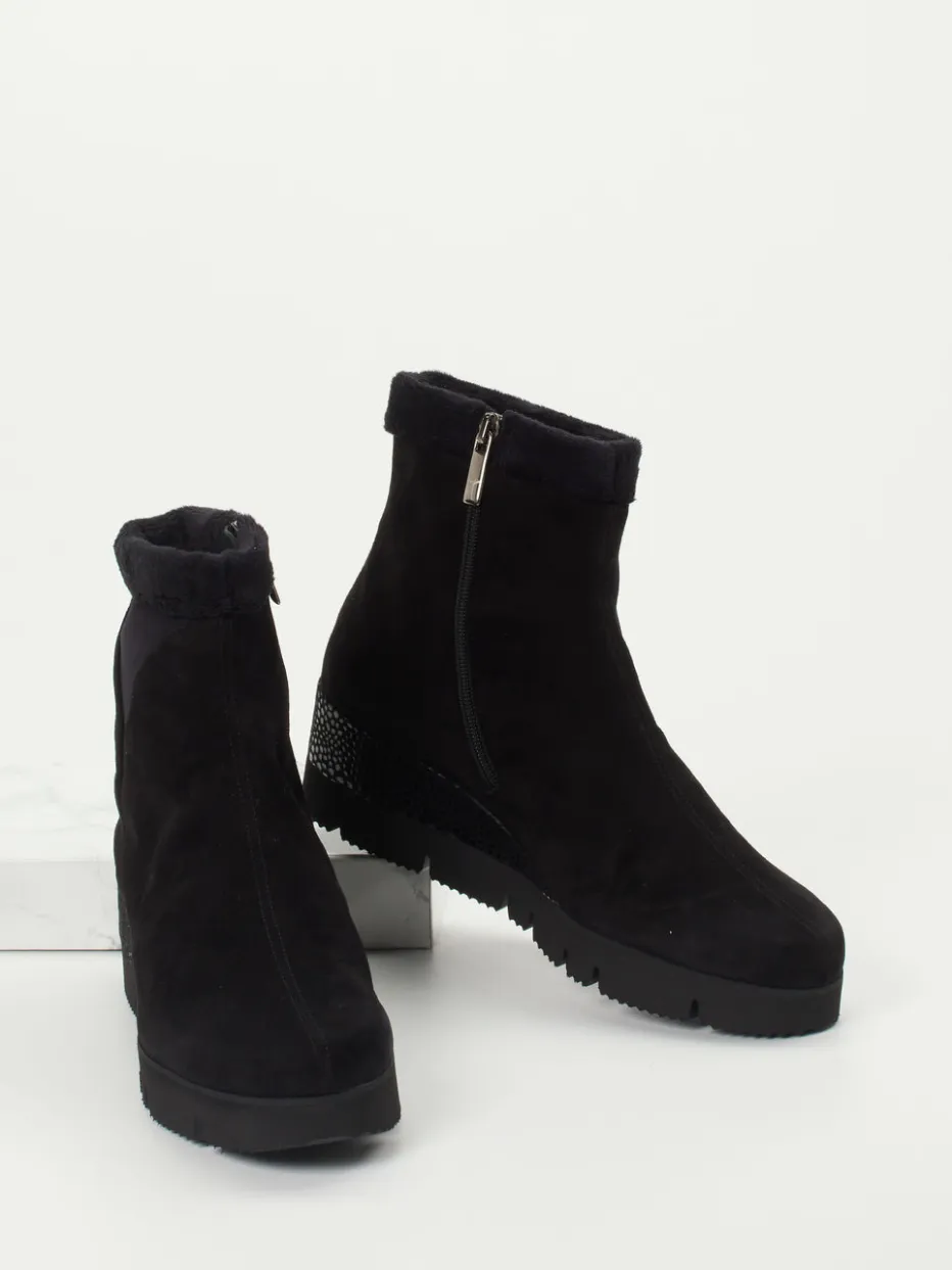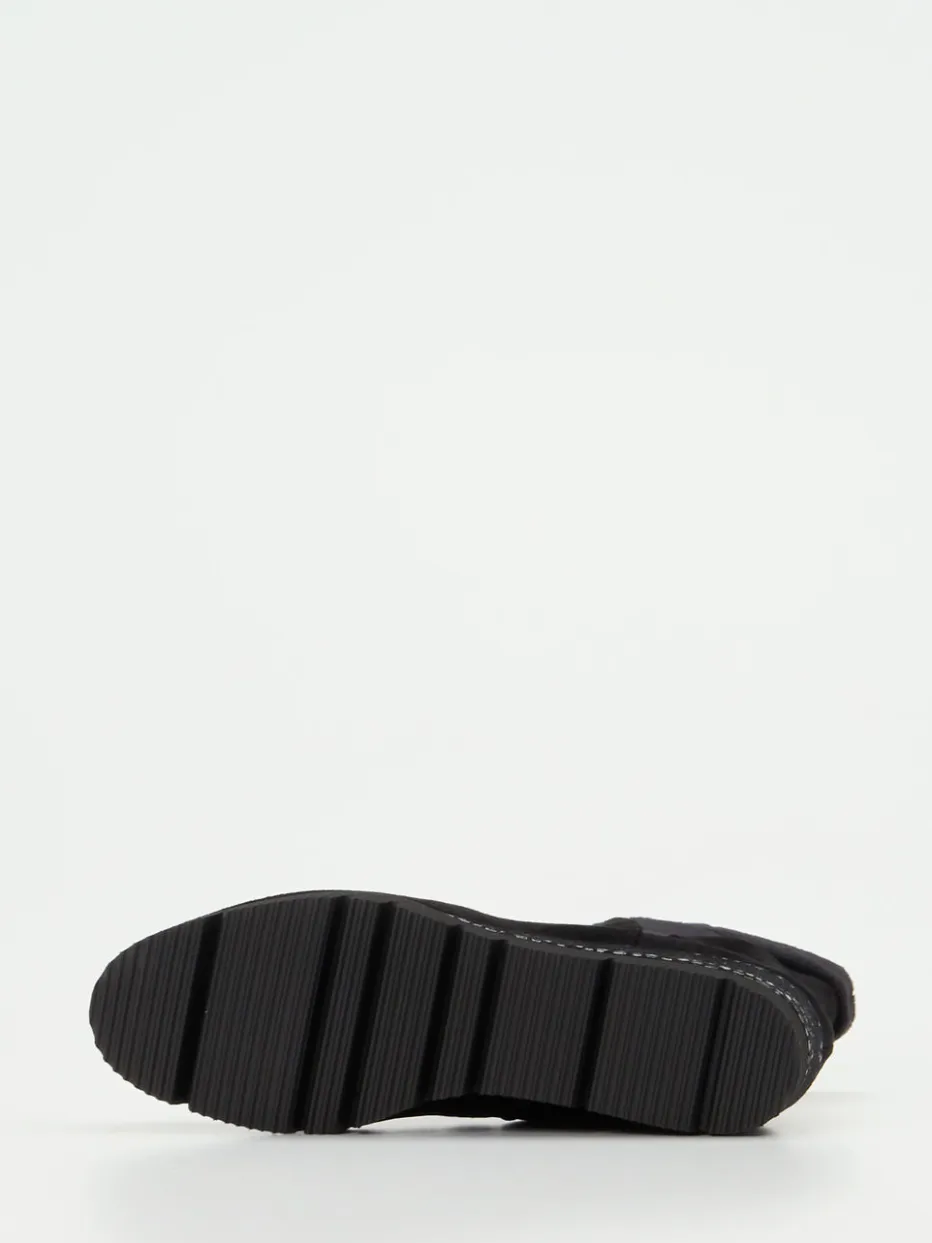 Ideal für entspannte Wintertage mit Stilbewusstsein: Das schwarze Veloursleder ist samtig-matt und trifft auf einen geprägten Keilabsatz in Reptiloptik. Innen sorgt flauschiges Kunstfell für wohlige Wärme, während der seitliche Reißverschluss mit Stretchmaterial einen unkomplizierten Einstieg bietet. Die rutschfeste Leichtzellsohle schafft Sicherheit auf rutschigen Untergründen. Inspiriert von Minimalismus und dem Trend zum „Quiet Luxury“, passt der Look hervorragend zu Thermoleggings und Oversize-Mänteln.