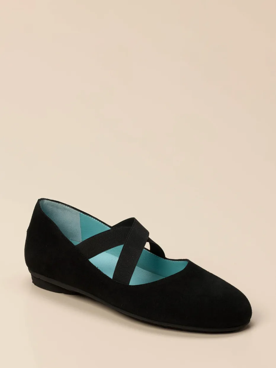 Die Mary Janes von Thierry Rabotin vereinen samtig weiches Veloursleder mit funktionalem Design. Überkreuzte Elastikriemen und ein gepolstertes Fußbett sorgen für stilvollen Komfort.