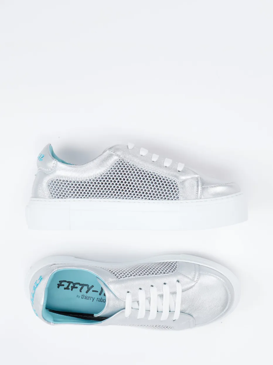 Retro-Futurismus trifft Streetstyle.Thierry Rabotin präsentiert einen Sneaker, der modischen Anspruch mit Komfort vereint. Ob beim Stadtbummel oder auf dem Weg zur nächsten Party – dieser Low-Top-Sneaker passt perfekt in urbane Alltagsszenarien. Silberfarbenes Metallicleder mit glänzender Oberfläche bildet gemeinsam mit weißen Mesh-Einsätzen in Wabenstruktur ein spannendes Materialspiel. Die abgerundete Silhouette wird durch türkisfarbenes Innenfutter aus softem Lammnappa und eine erhöhte, weiße Gummiplateausohle ergänzt. Auffällige Details wie die türkisfarbene Fersenstickerei setzen individuelle Akzente. Ein Top-Piece für Y2K-inspirierte Outfits. FIFTY-12 bietet hier ein Sneaker-Konzept mit maximalem Trendgespür und hohem Tragekomfort.