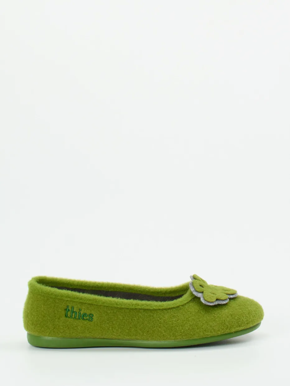 Gemütlichkeit in ihrer schönsten Form.Thies präsentiert einen komfortorientierten Ballerina-Hausschuh für Damen aus nachhaltigem Wollfilz. An kühlen Tagen bietet das Modell wohlig warme Entspannung im Innenbereich. Der apfelgrüne Filz strahlt Frische und Natürlichkeit aus und wird durch eine zweilagige Blütenapplikation in Grau akzentuiert. Die klassische, rund gearbeitete Form wird durch eine rutschhemmende Gummisohle ergänzt. Der Einstieg in Schlupfform betont die unkomplizierte Nutzung. Inspirieren lässt sich das Design von minimalistischen und loungetauglichen Trends wie Cottagecore. Ein Hausschuh für stilbewusste Ruhepole mit Fokus auf Komfort und dezente Verspieltheit.