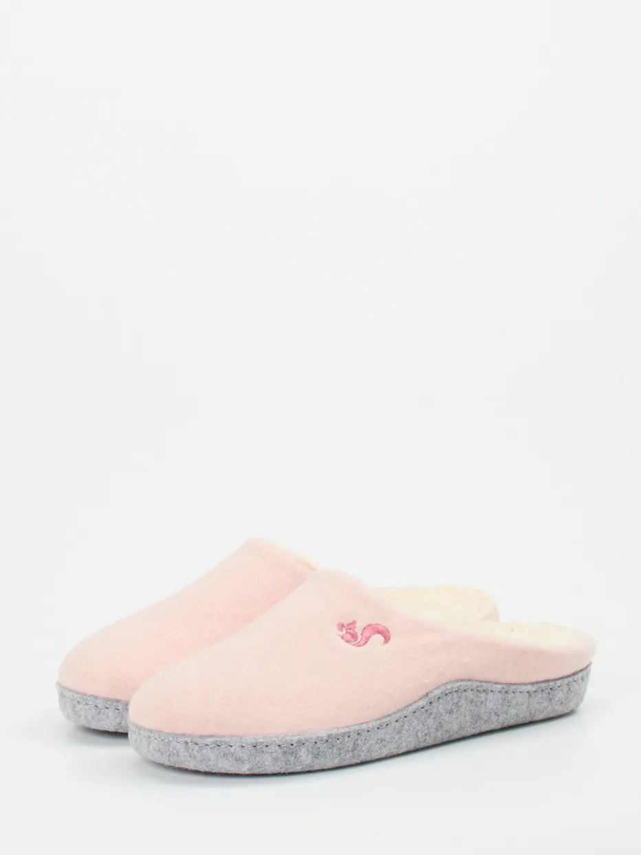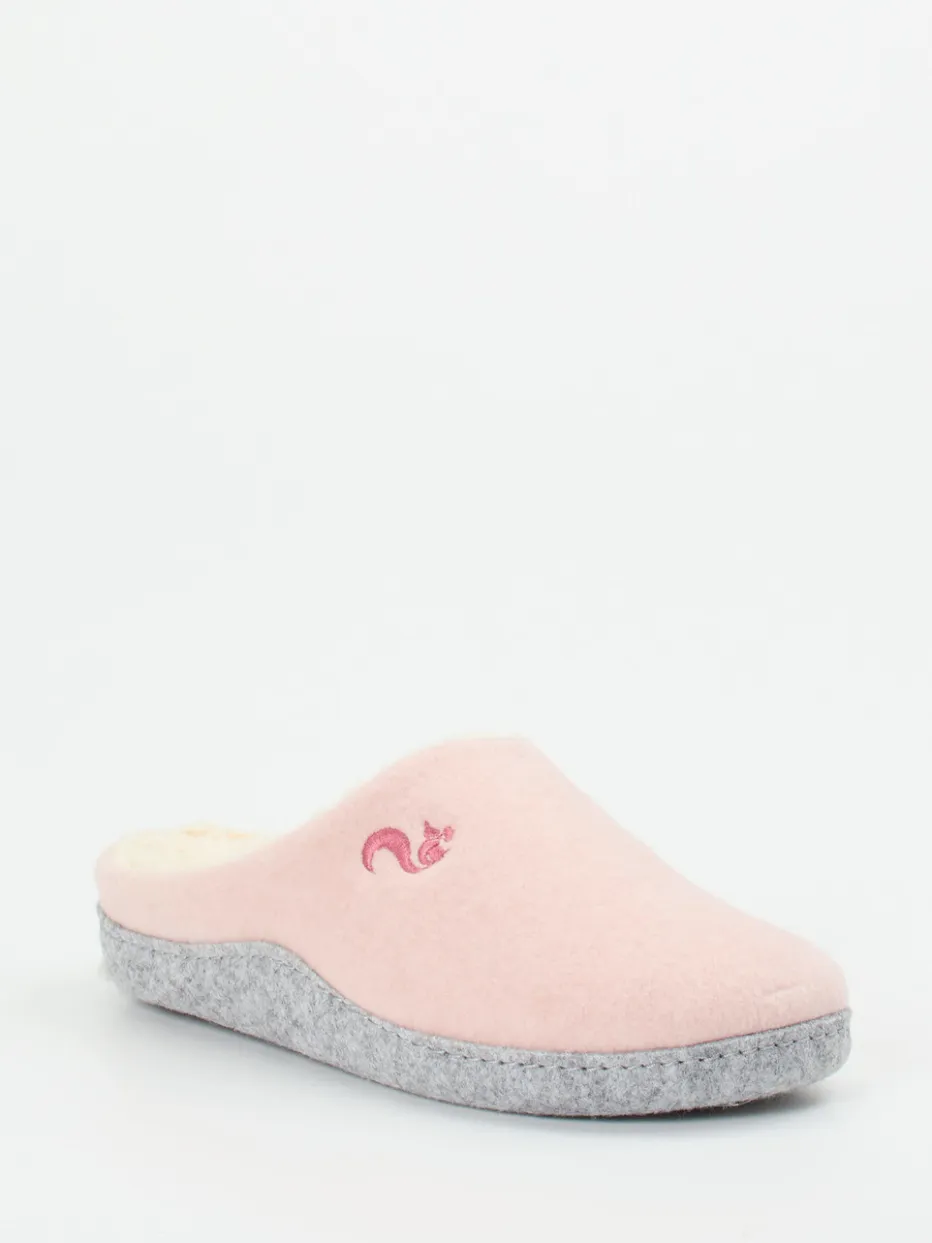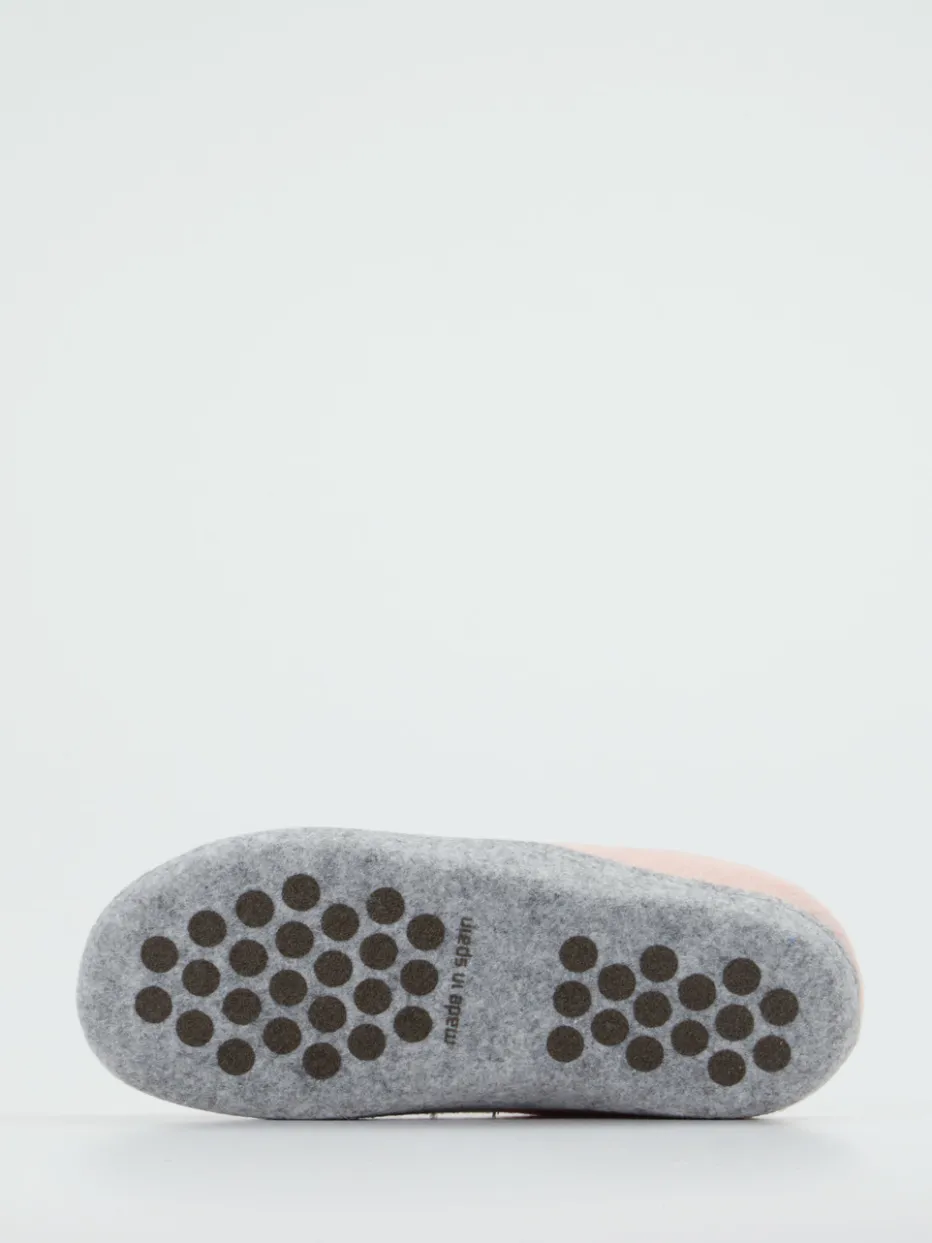 Ideal für kühle Morgen oder gemütliche Abende überzeugt das Paar mit rosafarbenem Filz aus recyceltem PET – samtig matt und formstabil. Das flauschige Textilfutter in Cremeweiß schmiegt sich angenehm an. Durch die offene Schlupfform mit geschlossenem Vorderfuß gelingt das Anziehen mühelos. Der hellgraue Filzboden mit Gummipunkten bietet Rutschfestigkeit, während ein Stickmotiv in Rosa liebevolle Akzente setzt. Im Look harmonisch zum Scandi-Trend passt der Hausschuh perfekt zu Loungewear in soften Pastells.