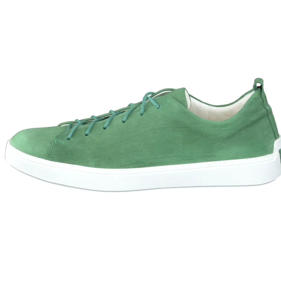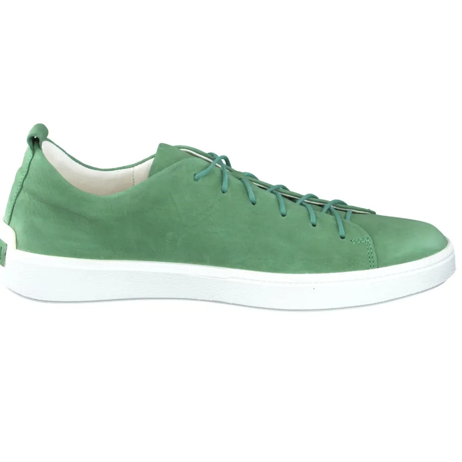 Schlichte Eleganz im Alltag.Think präsentiert mit diesem sportlich-minimalistischen Schnürschuh ein vielseitiges Modell für Freizeit und Büro. Der Schuh ist aus hochwertigem Kalbleder gefertigt, das samtig-matte Nubukstruktur zeigt und in trendigem Salbeigrün gehalten ist. Die klassische flache Form mit Ton-in-Ton-Schnürung, weißer Gummisohle und geprägtem Logo an der Ferse sorgt für ein modernes Gesamtbild, das ebenso funktional wie stilvoll auftritt. Die herausnehmbare Innensohle erlaubt den Einsatz individueller Einlagen – ideal für langes Gehen oder Stehen im urbanen Alltag. Der Look harmoniert besonders gut mit natürlichen Farbtönen wie Beige oder Offwhite. Ein nachhaltiger Komfortschuh im Zeichen reduzierter Ästhetik von Think.
