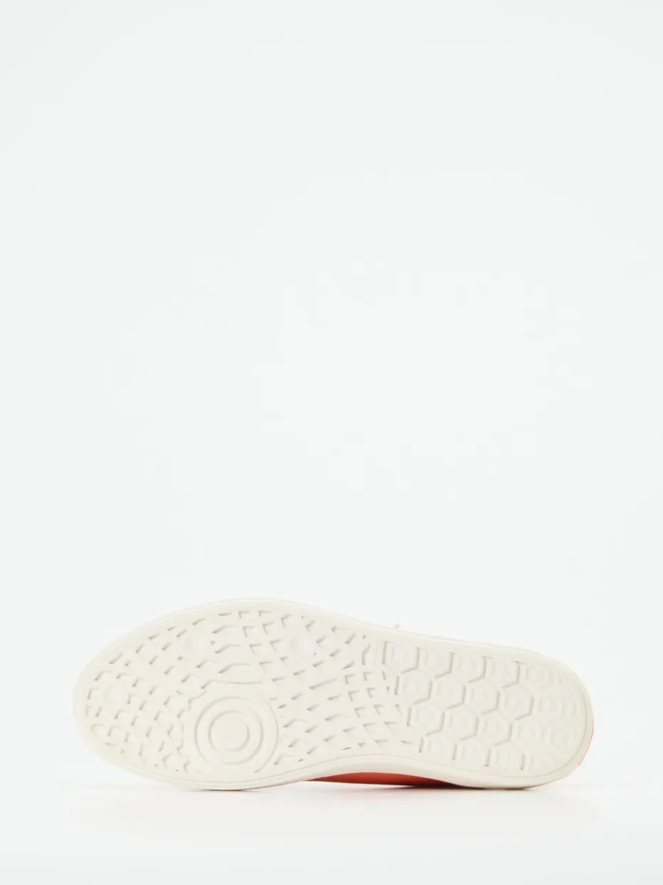 Highlight in Koralle.Think präsentiert mit diesem Sneaker ein stilvolles Modell aus hochwertigem Kalbleder – ideal für Freizeit und Urlaub. Für sommerliche Leichtigkeit sorgt das ungefütterte, korallrosafarbene Leder mit natürlich genarbter Oberfläche. Die klassische, flache Silhouette erhält durch weiße Zehenkappe und farbigen Schnürsenkel-Stopper einen modernen Akzent. Die profilierte Gummisohle mit Wabenstruktur bietet Trittsicherheit, während die gepolsterte Innensohle den Tragekomfort erhöht. Minimalistische Linienführung, klare Formgebung und Streetwear-Einflüsse machen diesen Sneaker zum kombistarken Highlight zu Off-White oder Leinenlooks. Durchdachter Komfort mit femininer Farbsetzung für unbeschwerte Stadtspaziergänge.