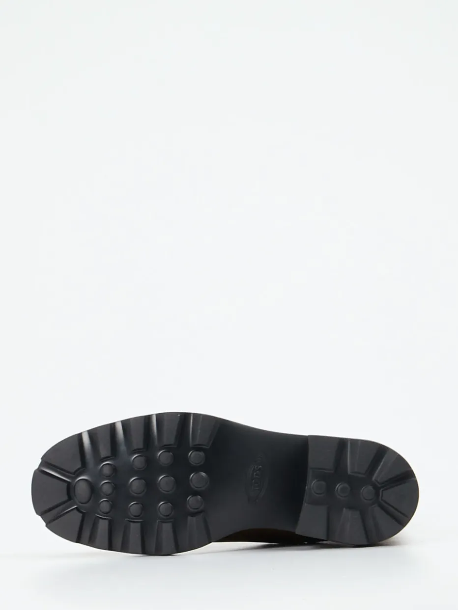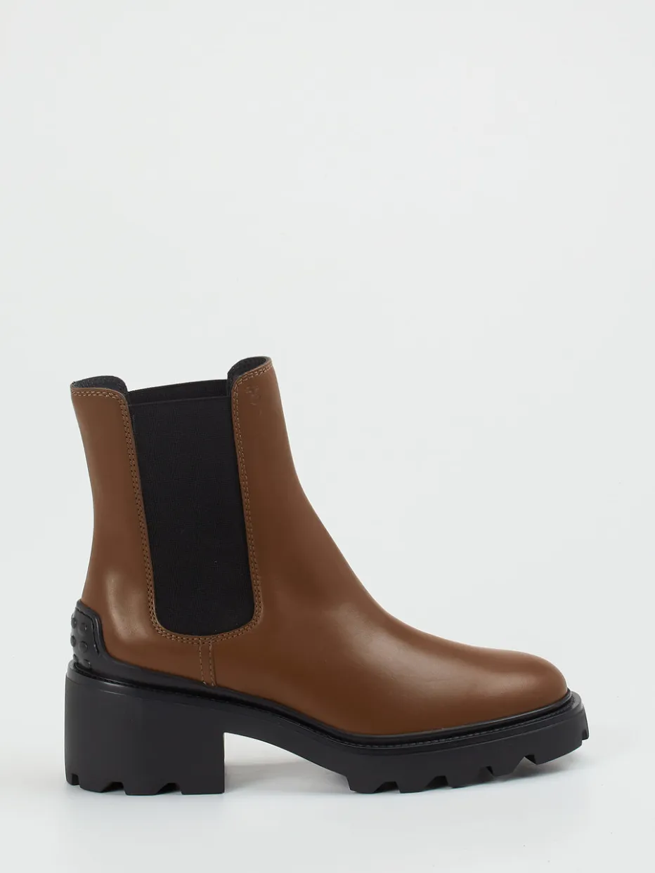 Komfortabel durch Stadt und Büro.Tod’s interpretiert klassische Chelsea Boots mit luxuriösem Anspruch neu. Für stilvolle Tage zwischen Terminen und Wochenendbummel: Diese Chelsea-Stiefelette aus cognacbraunem Kalbleder vereint einen klaren, minimalistisch-urbanen Look mit funktionalem Komfort. Die elastischen Einsätze in Schwarz sorgen für einfaches An- und Ausziehen, während die markante schwarze Profilsohle mit 6 cm Absatz sicheren Stand und modernen Charakter verleiht. Dezente Ton-in-Ton-Nähte, das eingeprägte Logo am Schaftrand und die typische Fersenkappe mit Noppen unterstreichen den exklusiven Markenstil. Ideal kombinierbar mit Strickkleidern oder cropped Pants. Ein anspruchsvoller Streetwear-Boot mit Signaturdetails von Tod’s.