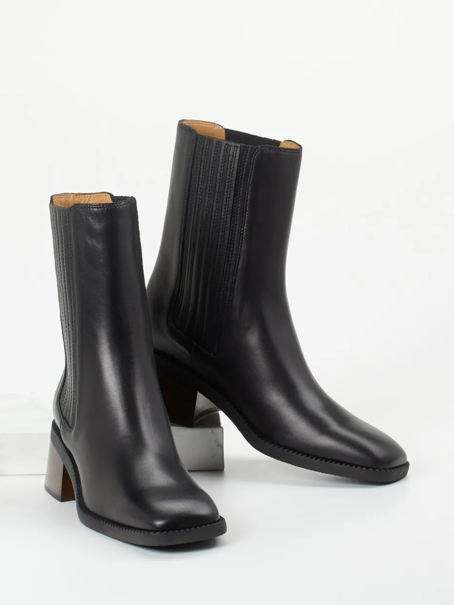 Reduziert auf das Wesentliche.Tod’s interpretiert die klassische Damen-Stiefelette neu und setzt mit diesem Chelsea Boot auf ein zeitloses Design. Ideal für smarte Herbstlooks in der City: Das tiefschwarze Glattleder trifft auf tonale Elastikeinsätze, die mit lederüberzogenen Applikationen dezent akzentuiert sind. Die glänzende Oberfläche verleiht der geradlinigen Silhouette zusätzliche Raffinesse, während der fünf Zentimeter hohe Blockabsatz in Holzoptik als stilvoller Kontrast punktet. Minimalistisch und doch markant fügt sich das Modell in die Trends „Quiet Luxury“ und „Clean Aesthetic FW24“ ein. Kombiniert mit einem camelfarbenen Wollmantel entsteht ein souveräner Look. Ein Chelsea Boot, der Handwerkskunst und Stilbewusstsein repräsentiert – kompromisslos Tod’s.