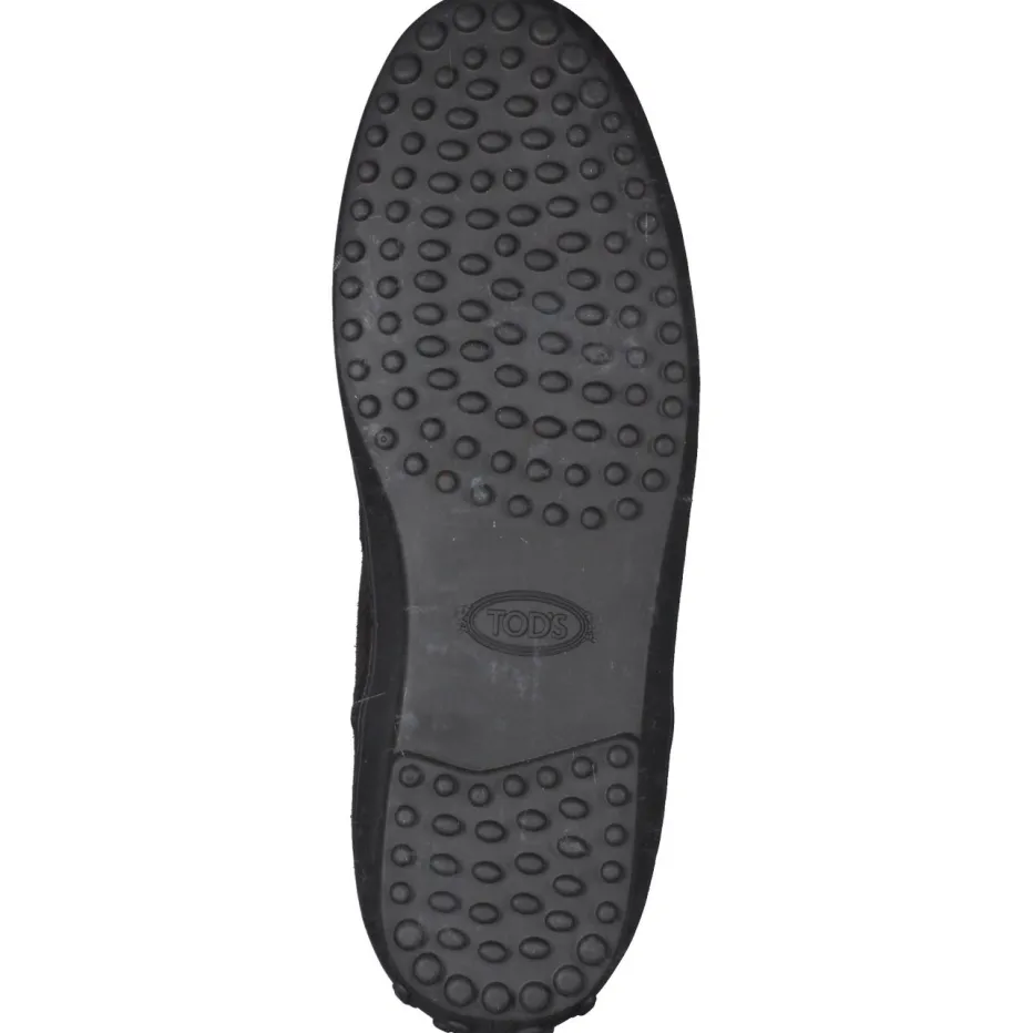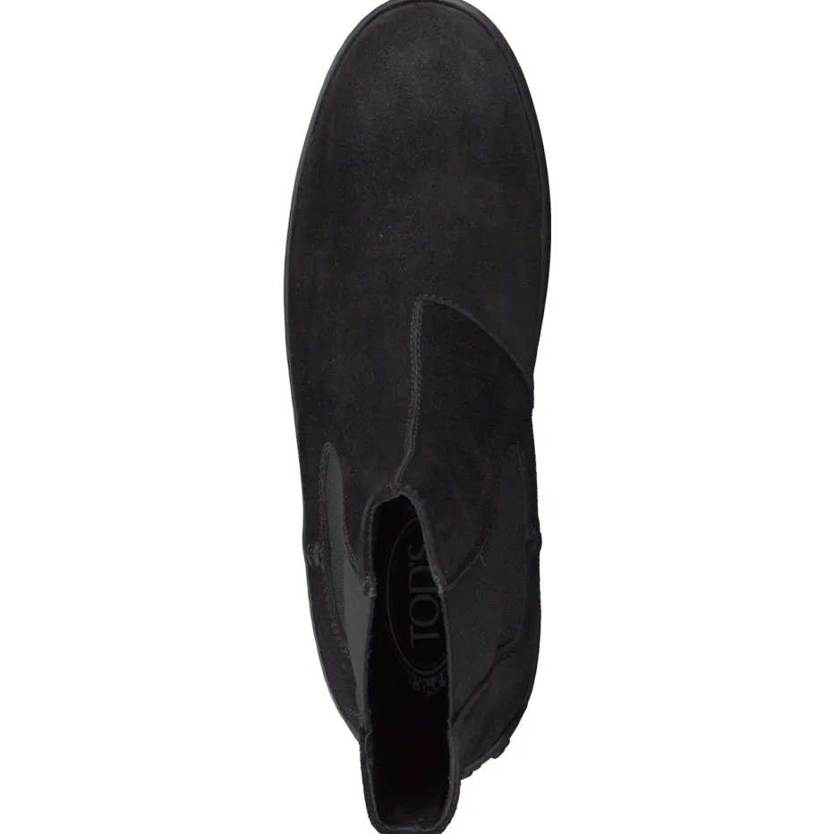 Minimalistischer Chic für citytaugliche Looks.Die Marke Tod’s zeigt bei diesen Damen-Chelsea Boots einen raffinierten Mix aus Understatement und Funktion. Für Stilbewusste, die im urbanen Alltag Wert auf Qualität und klaren Look legen: Schwarzes, samtig angeschliffenes Veloursleder verleiht dem Modell eine tiefmatte Anmutung. Seitliche Elastikeinsätze und die profilierte Gummisohle mit typischem Noppenprofil stehen für Komfort und Grip. Klassisch-knöchelhoch geschnitten, lässt sich der Boot vielseitig im Streetwear- oder Business-Kontext stylen. Ton-in-Ton-Nähte und dezentes Außenlogo betonen den ruhigen, hochwertigen Charakter. Ein Statement für reduzierte Eleganz mit ikonischem Markenbezug.