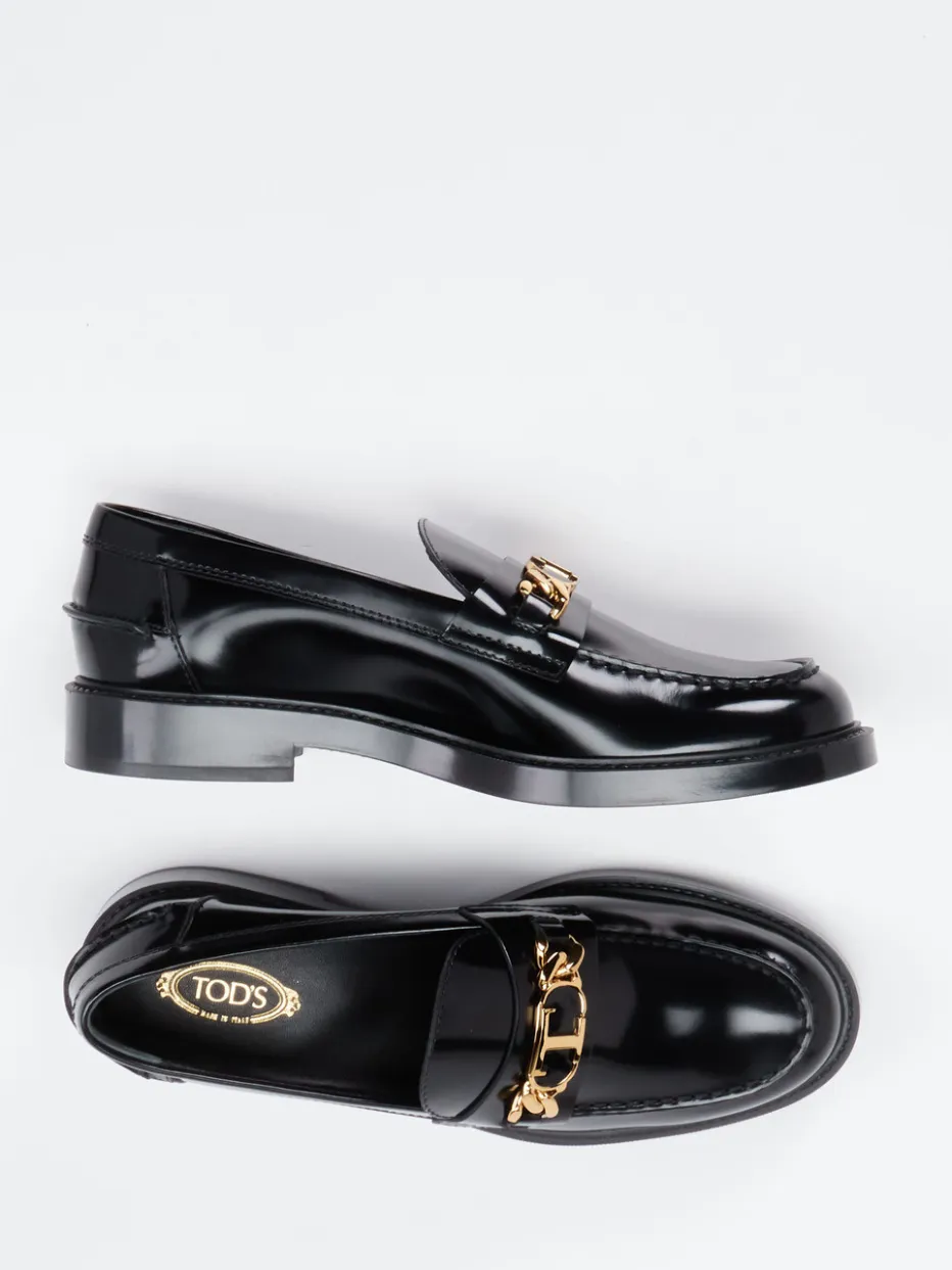Eleganz für Business und Alltag.Tod’s interpretiert den klassischen Damen-Loafer mit anspruchsvoller Raffinesse. In hochwertigem Hochglanzleder gefertigt und in tiefem Schwarz gehalten, erfüllt dieser Loafer Ansprüche an Stil und Komfort. Die klassische Lowcut-Form, das dezente Nahtbild sowie die markante goldfarbene Kettenspange setzen elegante Akzente. Die profilierte Gummisohle mit Marken-Noppen sorgt dabei für Trittsicherheit im gehobenen Alltag und im Büro. Italian Heritage und der Trend „Quiet Luxury“ prägen das Design mit Understatement. Kombiniert mit einem Wollmantel entsteht ein souveräner City-Look. Markentypische Qualität trifft auf klare Formsprache und stilvolles Detail.