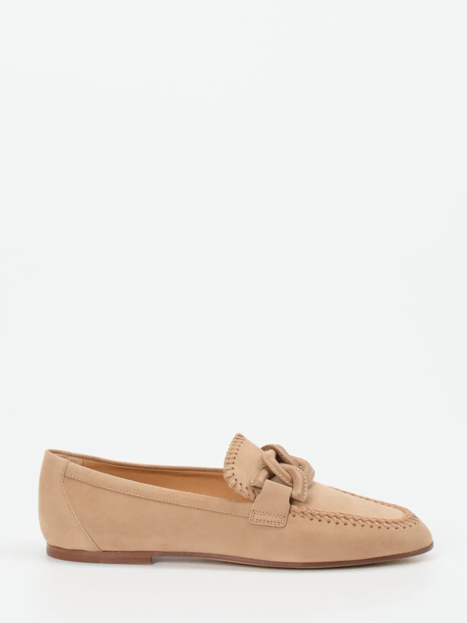 Fein geschliffenes Nubukleder, kombiniert mit einer Ton-in-Ton-Kette, verleiht dem klassischen Loafer von Tod’s eine moderne Note. Die flache Silhouette passt perfekt zu minimalistischen Looks.