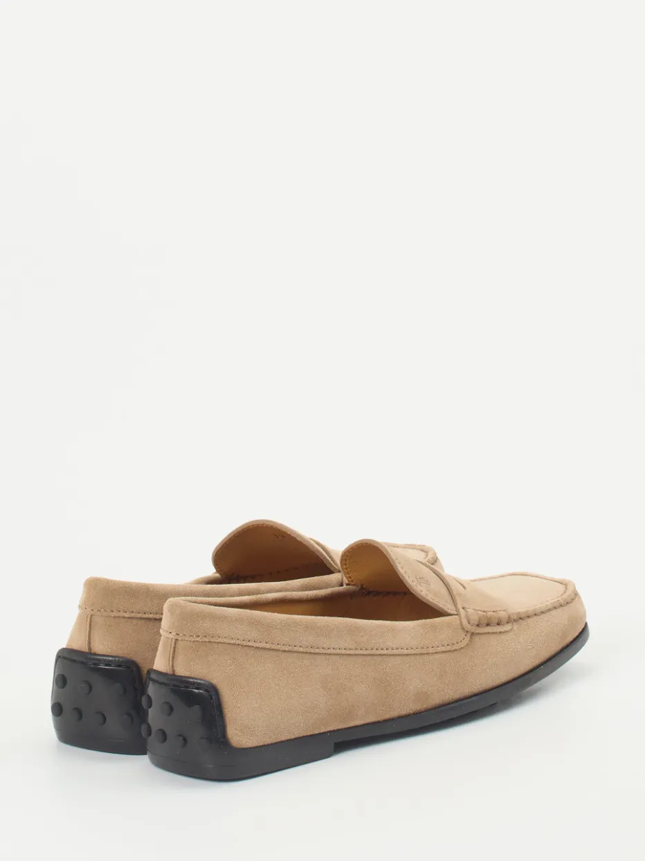 Dieser Damen-Loafer von Tod’s kombiniert sandbeiges Veloursleder mit klassischer Mokassin-Optik und einer rutschhemmenden Noppensohle. Ideal für stilvolle Alltags- und Business-Looks.