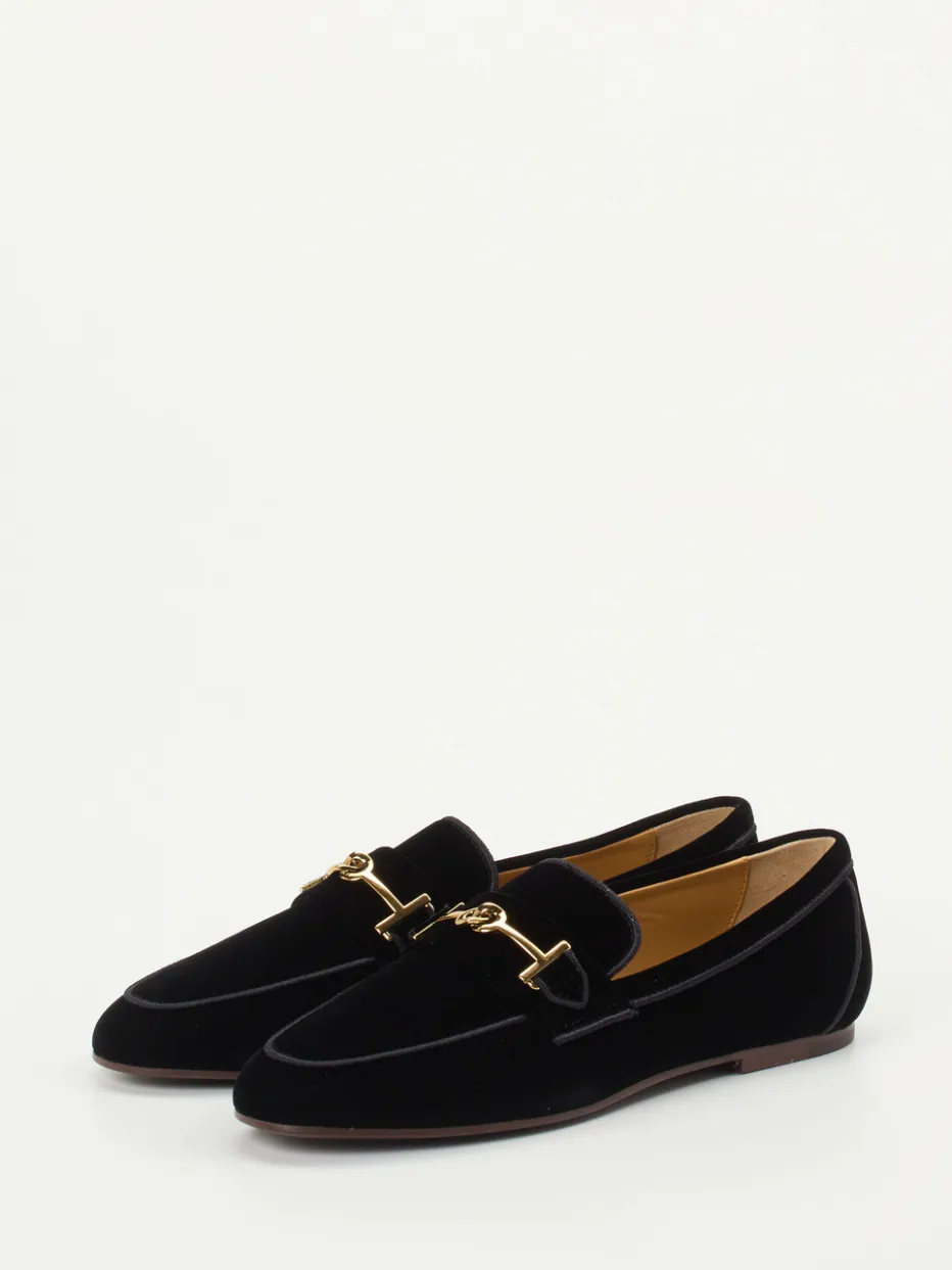 Dieser Damen-Loafer von Tod’s aus samtigem Veloursleder vereint klassische Form mit luxuriösem Minimalismus. Die vergoldete Spange und edle Verarbeitung betonen den Anspruch auf stilvolle Zurückhaltung.