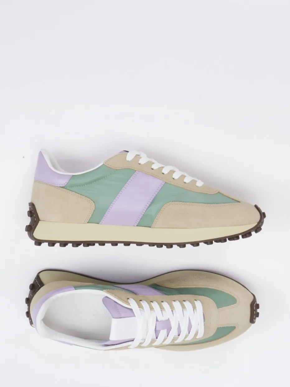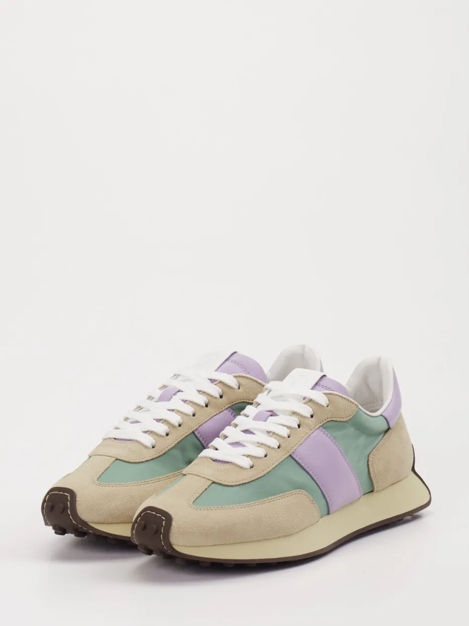 Pastelltöne neu interpretiert. Tod’s präsentiert einen modischen Sneaker im charakteristischen Retro-Stil. Für entspannte Citytouren oder den Spaziergang in der Frühlingssonne bietet dieses Modell idealen Komfort. Der Materialmix aus Veloursleder und Textil sorgt für ein angenehmes Tragegefühl bei gleichzeitig robuster Ausstrahlung. Das Design zeigt sich in Beigegrau mit kontrastierenden Einsätzen in Flieder und Salbeigrün – ein klarer Verweis auf die Pastelltrends der Saison. Die flach gehaltene, leicht keilförmige Silhouette umschließt den Fuß formschön, unterstützt durch eine profilierte Gummisohle mit Noppen. Weiße Schnürsenkel und eine gepolsterte Ferse unterstreichen den sportiven Charakter. Ideal kombinierbar mit hellen Casual-Outfits. Stilbewusster Komfort im Signatur-Stil von Tod’s.
