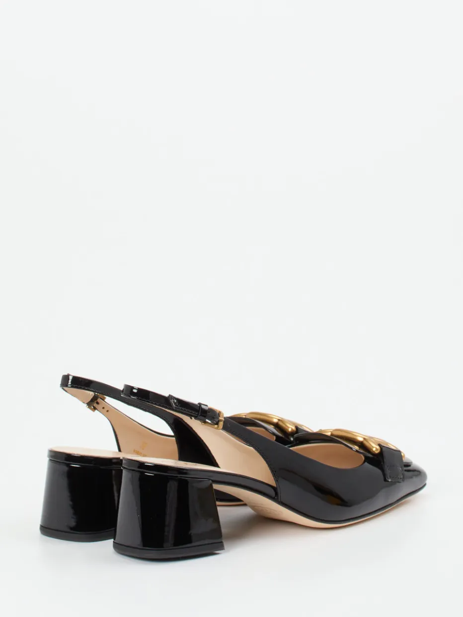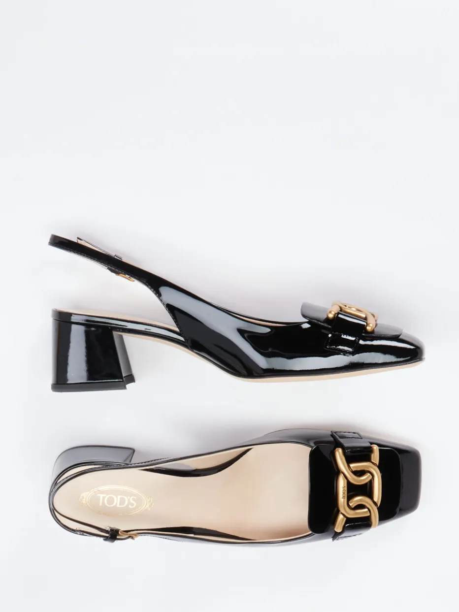 Diese Slingback-Pumps von Tod’s vereinen glänzendes Lackleder mit goldfarbener Kette zu einem luxuriösen Stilstatement – perfekt für festliche Anlässe und elegante Business-Looks.