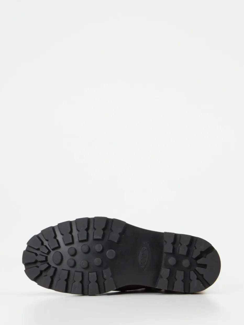 Die luxuriöse Stiefelette von Tod’s kombiniert hochwertiges Veloursleder mit goldfarbenen Details und einer markant profilierten Chunky-Sohle – ideal für stilbewusste Herbstlooks.