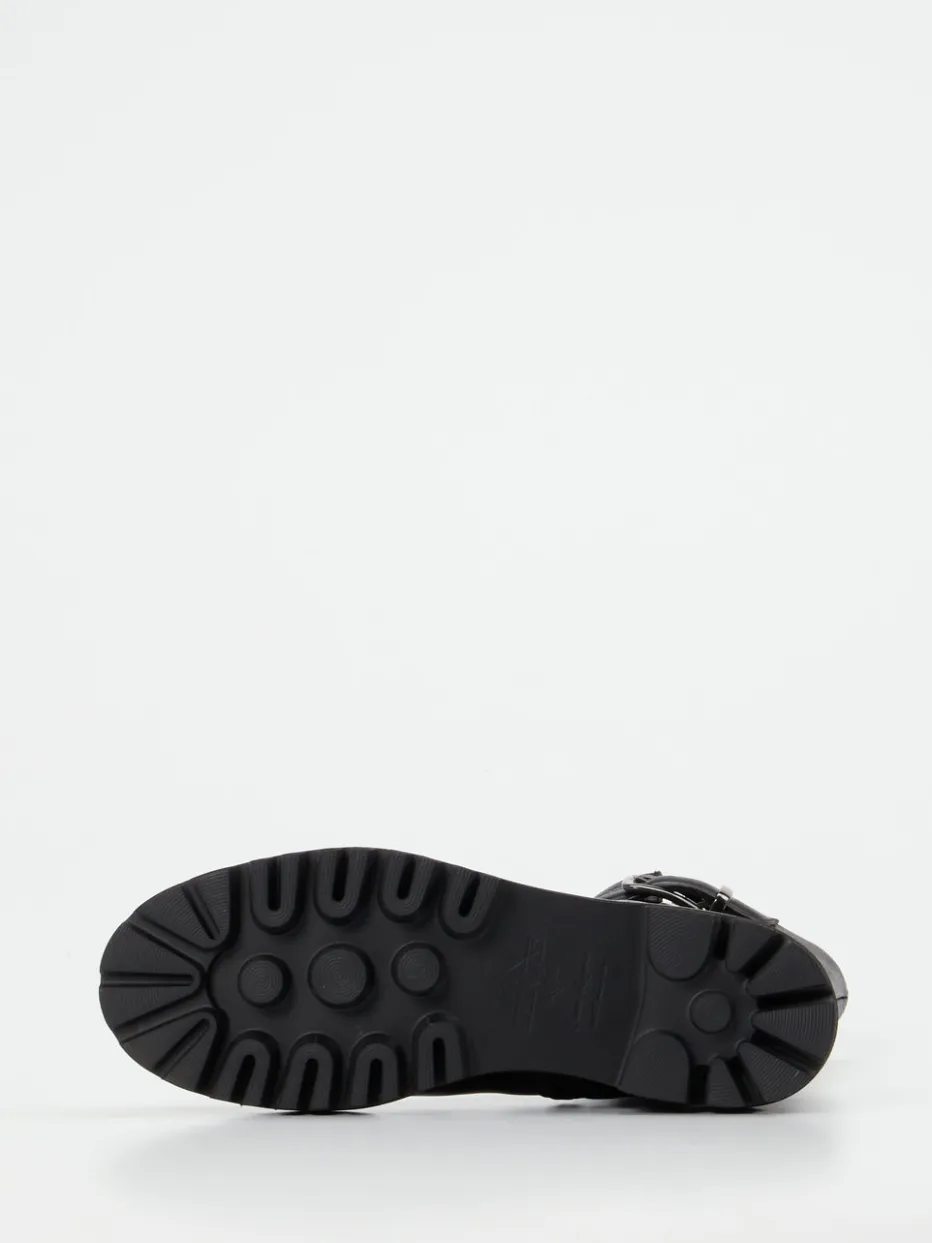 Ideal für Alltag, Stadtspaziergänge oder Wochenendtrips: Das schwarze Kalbleder zeigt sich in einer Kombination aus glatter und leicht genarbter Struktur. Gunmetal-farbene Metallschnallen setzen rockige Akzente, ergänzt durch einen praktischen Reißverschluss. Die profilierte Gummisohle mit 4 cm Absatz liefert einen cleanen Utility-Charakter und sicheren Tritt. Der mittelhohe Schaft verleiht Stabilität und wirkt trotz Chunky-Design ausgewogen. Lammnappa-Futter und gepolstertes Fußbett sorgen dabei für nachhaltigen Tragekomfort.