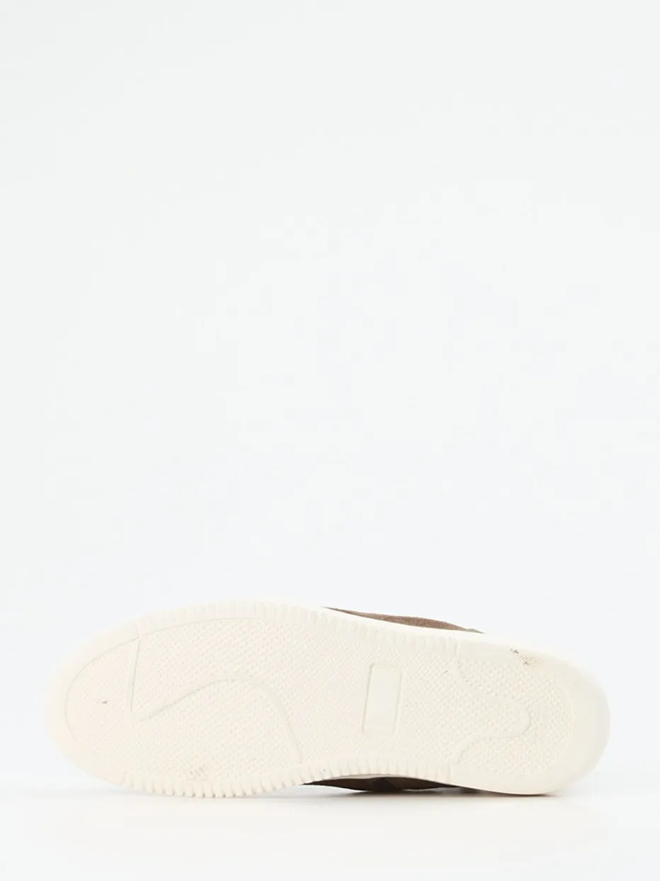 Herbstlicher Stil trifft urbane Linien.Truman’s präsentiert einen stilvollen Herren-High-Top-Sneaker aus feinem Veloursleder. Ideal für die kühleren Tage in der Stadt verbindet dieser Sneaker samtig genarbtes Veloursleder mit Details aus Glattleder in Olivgrün und Bordeaux. Der klassische, hoch geschnittene Schaft ist weich gepolstert und durch einen seitlichen Reißverschluss komfortabel zu handhaben. Farblich setzt die weiße Gummisohle einen gekonnten Kontrast zum schokobraunen Obermaterial. Innen sorgt beiges Lammnappa für angenehmen Tragekomfort. Ein urbaner Begleiter für modisch entspannte Styles mit Qualitätsfokus – handgefertigt mit der Handschrift von Truman’s.