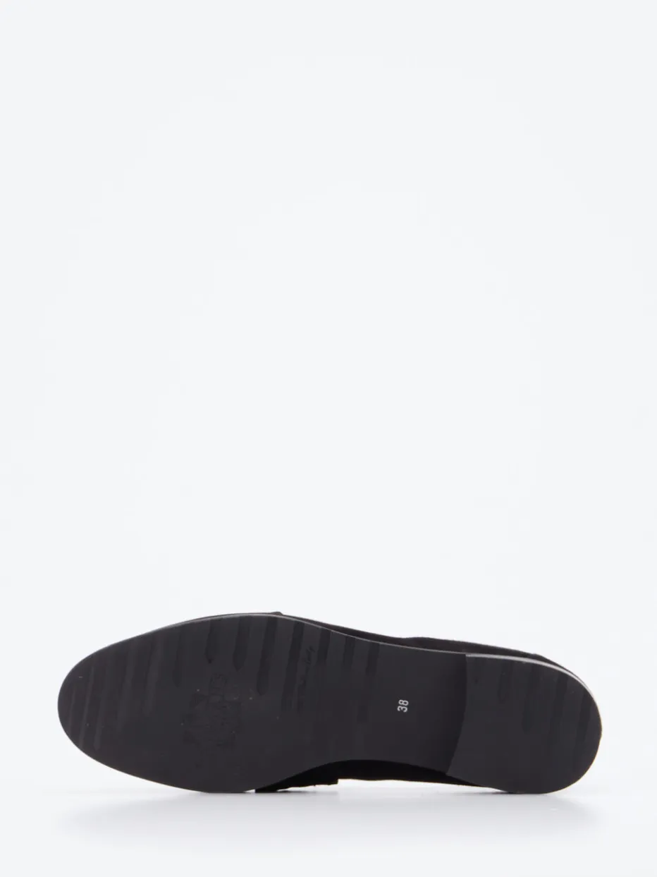 Dieser schwarze Loafer von Truman’s vereint hochwertiges Veloursleder mit einer klassischen Silhouette und dezentem Fransen-Detail – ideal für minimalistische Looks mit Anspruch.