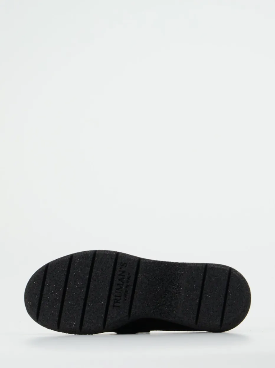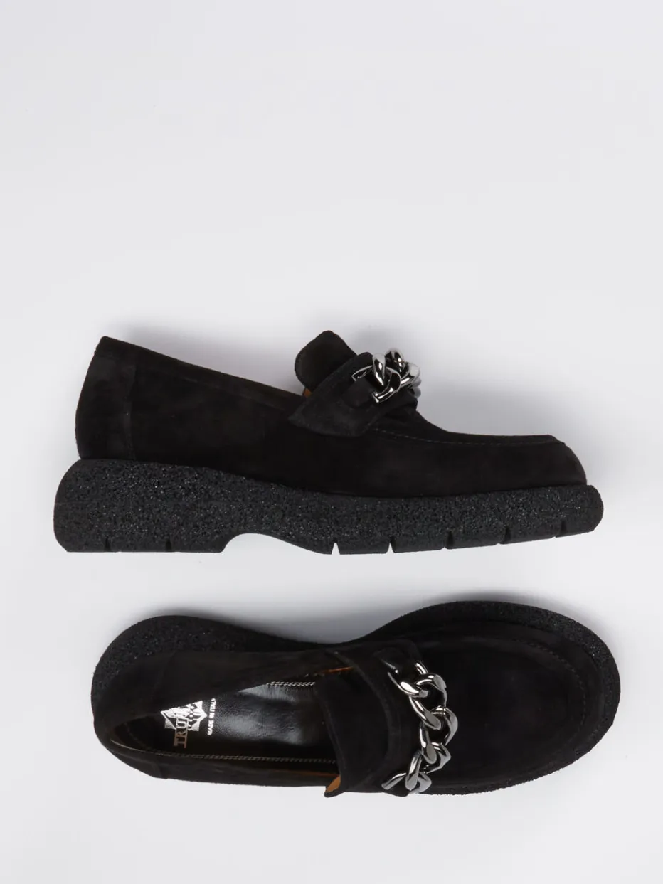 Puristisches Design trifft auf Kettendetail.Die Marke Truman’s interpretiert den Damen-Loafer neu und setzt auf klare Linien und hochwertige Materialien. Ideal für einen urbanen Business-Tag oder den modischen Wochenendstil: Das geschmeidige Veloursleder wirkt durch die matte Oberfläche besonders hochwertig. In tiefem Schwarz gehalten, überzeugt das Modell mit silberfarbener Statement-Kette auf dem Blatt. Die klassische Silhouette wird durch eine futuristisch anmutende Plateausohle aus Leichtzellmaterial modern ergänzt. Dank Mokassinnaht und gepolstertem Fußbett entsteht ein stilvoller Mix aus Komfort und Eleganz. Ein Favorit für trendbewusste Minimalistinnen. Design-Balance aus italienischem Qualitätsverständnis und modischer Raffinesse.
