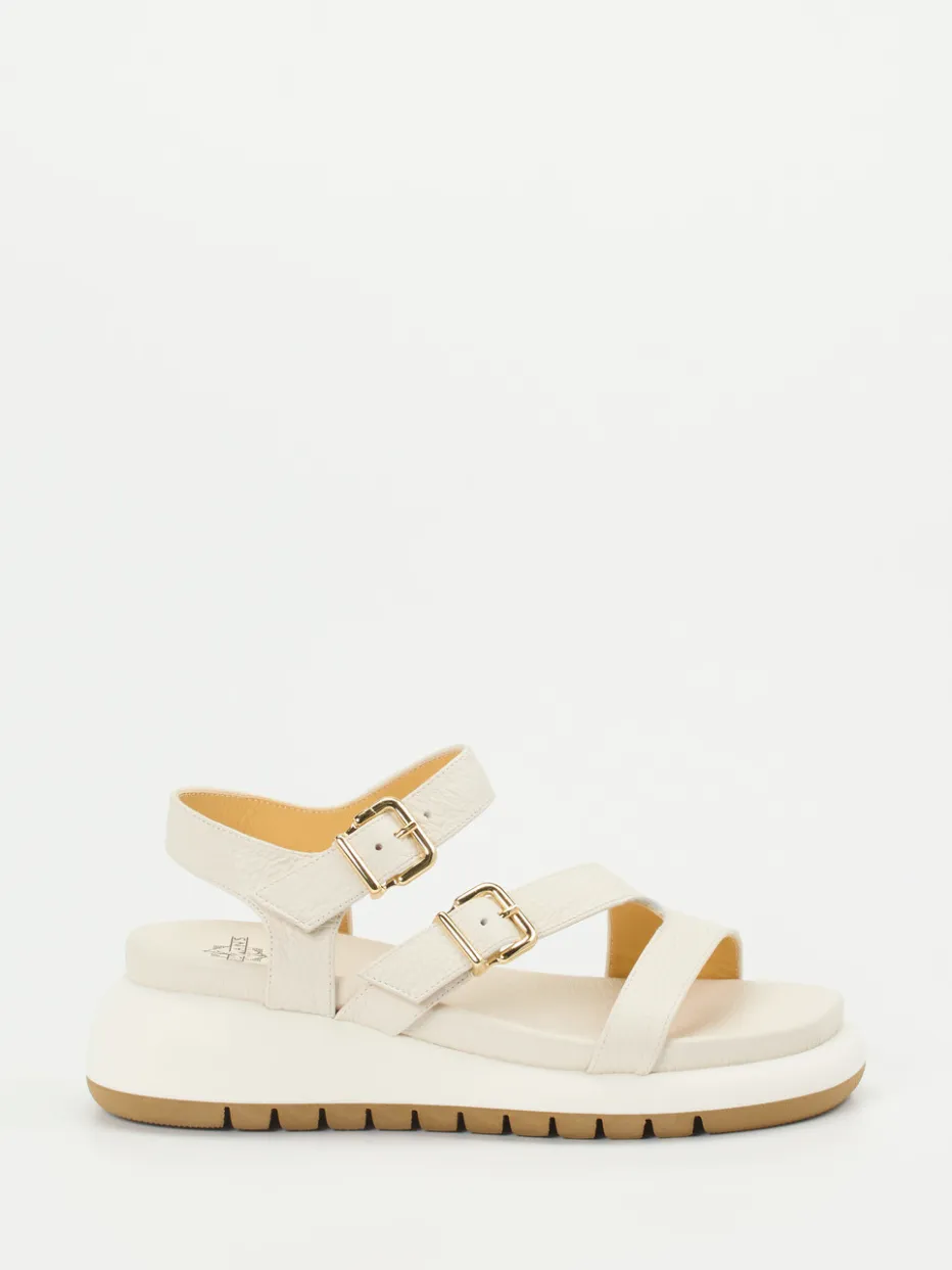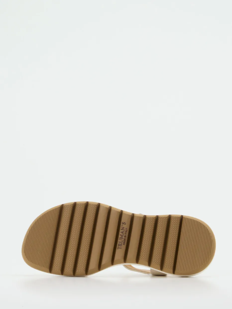 Leichtigkeit trifft auf sommerlichen Komfort.Truman’s präsentiert mit diesen Damen-Plateausandalen ein stilvolles Modell für warme Tage. Ob bei Stadtbummeln oder auf Reisen – die gepolsterte Innensohle und geschäumte Leichtzellsohle bieten langanhaltenden Tragekomfort. Das cremefarbene Hirschleder mit genarbter Struktur verleiht den vier Riemen eine luxuriös-matte Optik, ergänzt von goldfarbenen Metallschnallen und einem hochgezogenen Fersenprofil. Die profilierte, cappuccinofarbene Sohle unterstützt den aktuellen Trend zu voluminösen „Chunky Sandals“ im Sinne des „Quiet Luxury“. Minimalistisch und doch selbstbewusst – ideal zu Leinenkleidern oder Naturtönen. Ein souveräner Auftritt mit italienischer Ledertradition und stilistischer Klarheit.