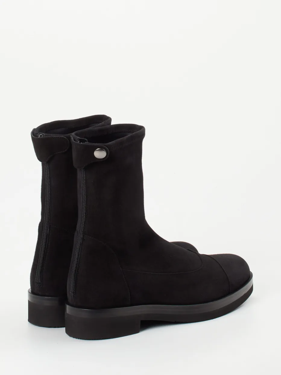 Diese schlicht designte Stiefelette überzeugt durch tiefschwarzes, samtig angeschliffenes Veloursleder und klare Silhouette. Perfekt für moderne Looks zwischen Büro und urbaner Freizeit.