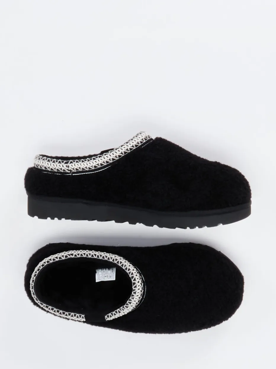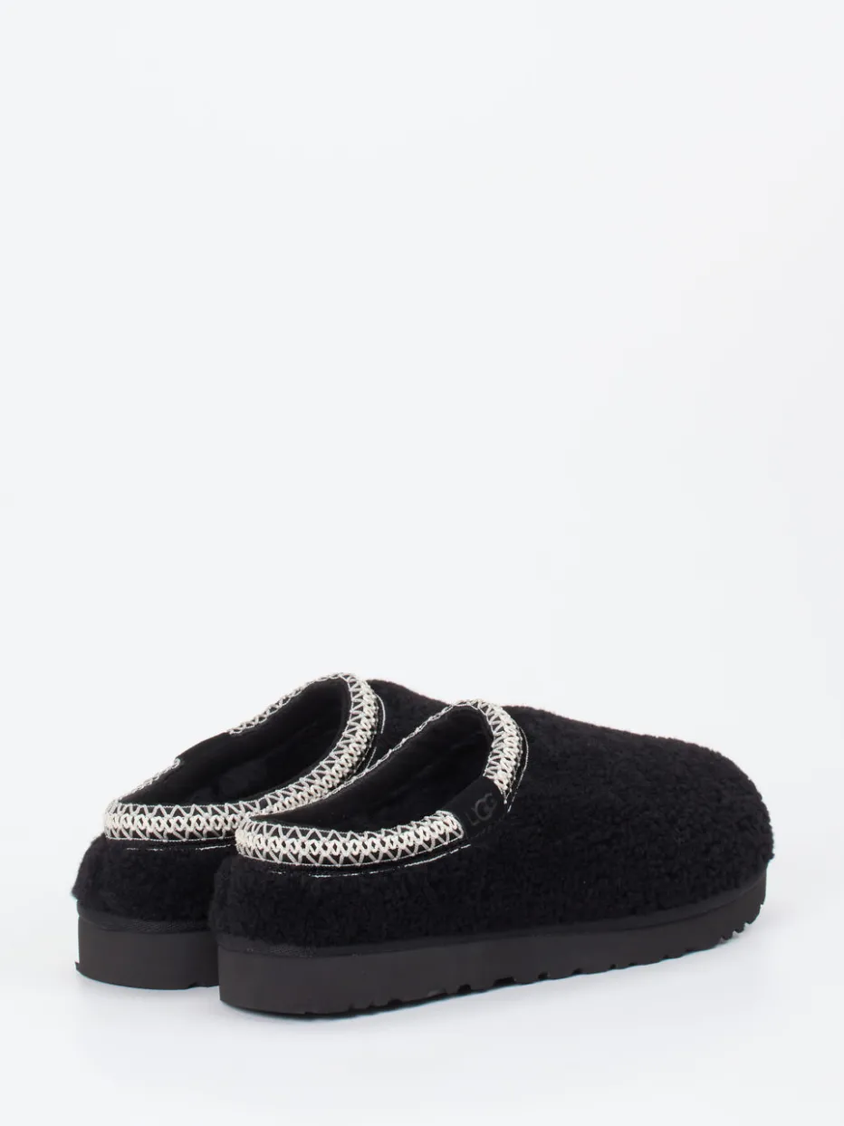 Ideal für entspannte Stunden zuhause oder kurze Wege nach draußen: Seine flauschige Oberfläche aus schwarzem Fell – einem Mix aus Wolle und Lyocell – verleiht dem Schuh eine florige, boucléartige Struktur. Die markante Offwhite-Zierborte sorgt für einen stilvollen Kontrast am Einstieg. Die offene Ferse, griffige Profilsohle und das weiche Innenfutter bieten sicheren Halt und ein angenehmes Tragegefühl. Inspiriert vom Cozy-Comfort-Trend, passt dieser Schuh hervorragend zu Loungewear.