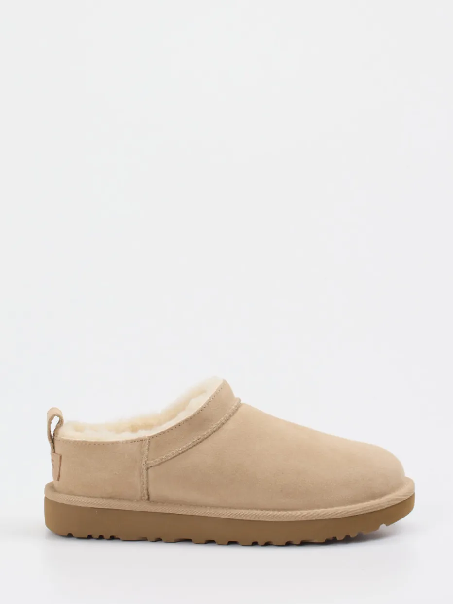 Wärme trifft Minimalismus.UGG präsentiert gefütterte Hausschuhe aus feinem Veloursleder. Dieses Modell überzeugt durch ein samtig weiches Lammfellfutter und eine flexible, profilierte Gummisohle. Für kalte Tage zu Hause bietet die kompakte Slipper-Form mit Zuglasche verlässliche Wärme und Trittsicherheit. Der beigefarbene Grundton wirkt harmonisch im Look, feine Ton-in-Ton-Nähte und eine dezente Logo-Prägung unterstreichen das schlichte Design. Inspiriert vom Cozy-Core-Trend beweist der Schuh stilbewusstes Understatement. Ein echtes Wohlfühl-Accessoire mit Fokus auf Funktion und Formvollendung – typisch UGG.