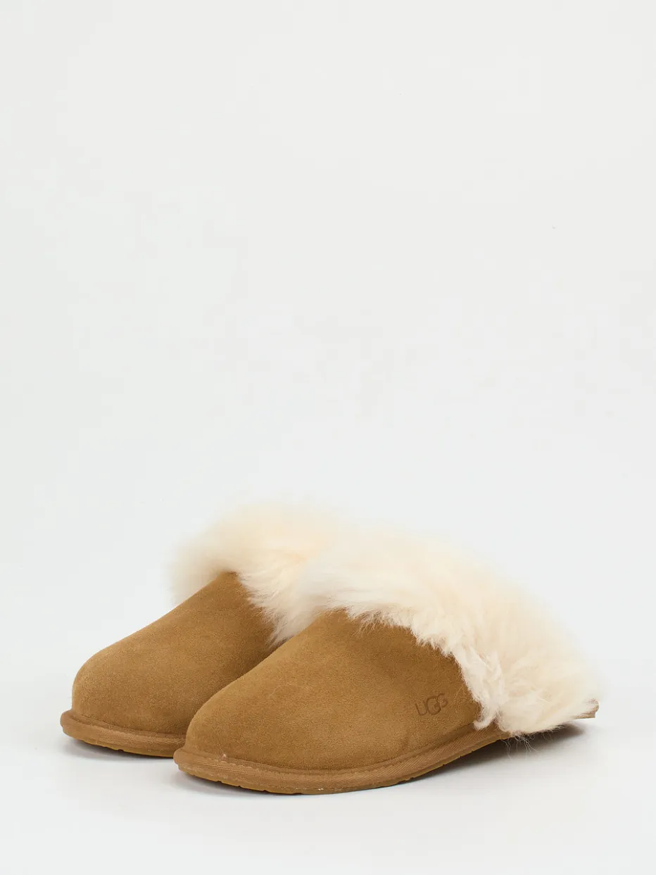 Wärme trifft Designkomfort.Der Hausschuh von UGG überzeugt als eleganter Begleiter für gemütliche Stunden daheim. Perfekt für kalte Böden im Winter bietet das Modell mit camelbraunem Veloursleder und echtem Lammfellfutter kuschelweichen Komfort. Der offene Fersenbereich sorgt für bequemes Hineinschlüpfen, das cremeweiße Fell setzt einen wohnlichen Akzent. Dank robuster Gummisohle mit Profil ist selbst ein Gang auf die Terrasse möglich. Der skandinavisch inspirierte Stil und dezente Logo-Prägungen runden das Design smart ab. Harmoniert ideal mit Loungewear in gedeckten Farben. Ein Hausschuh, der gemütliche Ästhetik mit Qualitätsbewusstsein vereint.