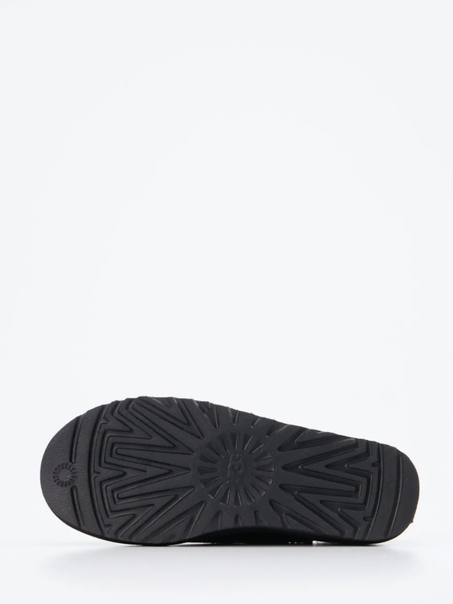 Wohlfühlkomfort für kalte Tage.UGG präsentiert mit diesen schwarzen Lammfell-Hausschuhen eine stilvolle Ergänzung für entspannte Stunden. Ob für das Wochenende auf dem Sofa oder den schnellen Gang vor die Tür: Das weich mattierte Veloursleder trifft auf ein wärmendes Futter aus natürlichem Lammfell. Die geschlossene, rundliche Form mit betonter Zuglasche hinten sorgt für einen komfortablen Sitz. Eine griffig profilierte Gummisohle lässt auch kurze Wege nach draußen zu. Sichtbares Innenfutter und Kontrastnähte setzen dezente Designakzente – voll im Trend von Quiet Luxury und Shearling Revival. Durchdachte Materialien und ikonische UGG-Gemütlichkeit in stilvoller Umsetzung.