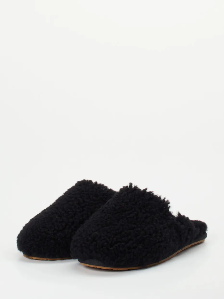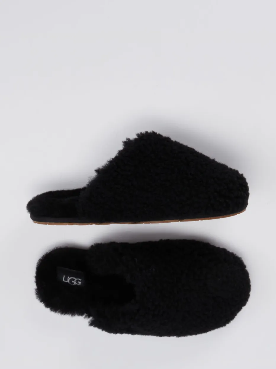 Schwarze UGG-Hausschuhe aus flauschigem Fell bieten luxuriösen Tragekomfort für entspannte Stunden daheim. Das minimalistische Design passt ideal zu modernen Loungewear-Looks.