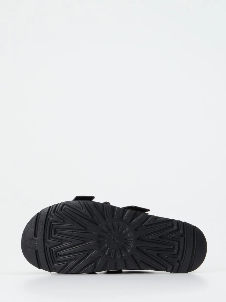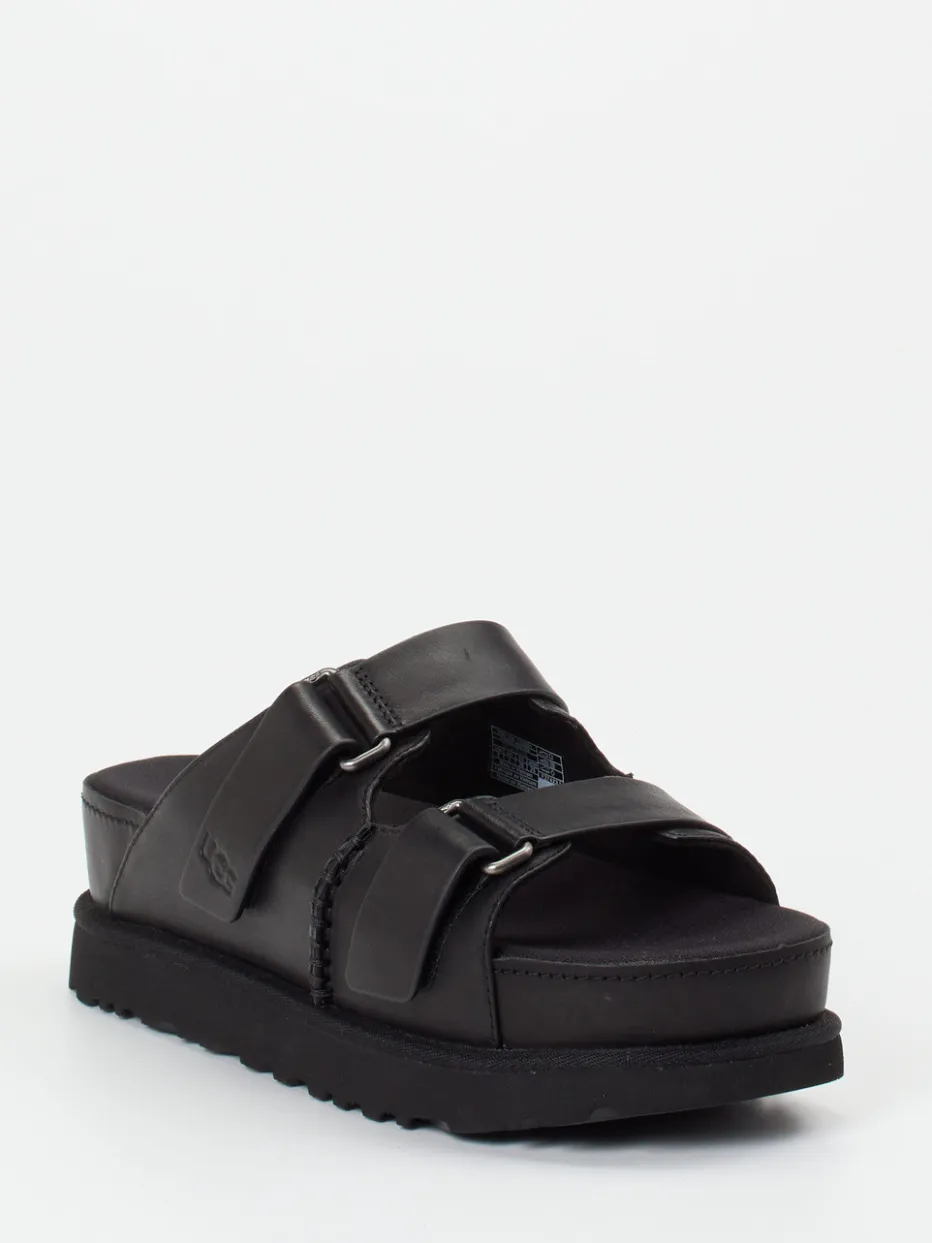 Chunky-Komfort für stilvolle Sommertage.UGG präsentiert mit der Goldenstar Hi Slide eine modische Plateau-Sandale mit funktionalem Fokus. Für entspannte Alltagsmomente liefert das schwarze Kalbleder mit matter Oberfläche eine hochwertige wie pflegeleichte Basis. Das Modell zeigt sich mit breiter Silhouette, ergonomisch gepolsterter Innensohle und verstellbaren Riemen mit Klettverschluss. Der ausgeprägte Plateau-Aufbau aus Leichtzell-Material verleiht dem Design nicht nur visuelle Präsenz, sondern auch einen zukunftsgewandten Streetwear-Akzent. Ton-in-Ton-Nähte und die dezente Logo-Prägung runden den Look minimalistisch ab. Ideal kombinierbar zu Relaxed Shorts oder Oversize-Shirts. UGG steht hier für Innovation im Komfortsegment – mit trendbewusster Unisex-Ausrichtung.
