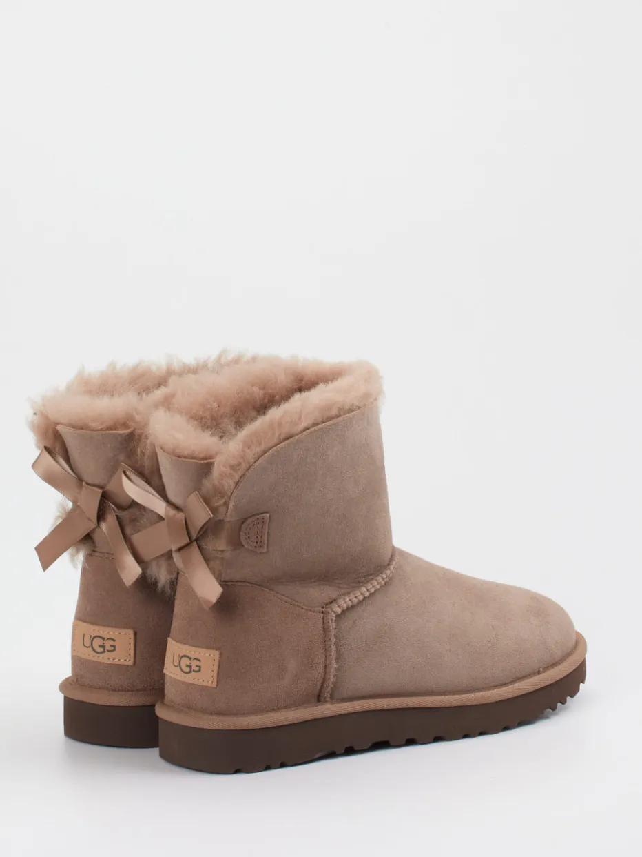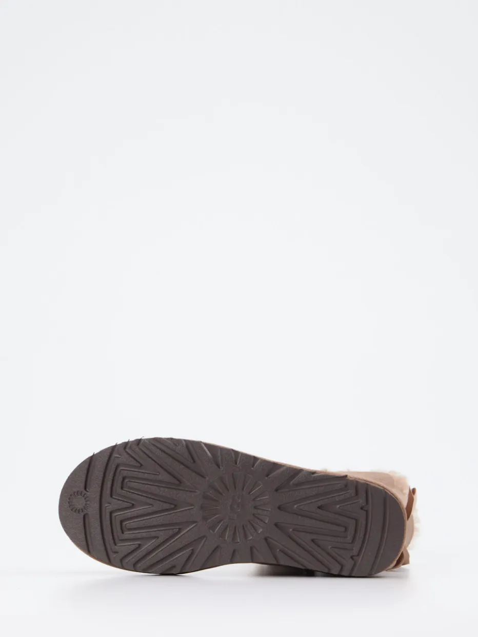 Wohlfühlen in stilvoller Wärme.Diese Damen-Stiefelette von UGG erfüllt den Anspruch an Komfort und Design zugleich. An kalten Tagen sorgt das wärmende Lammfellfutter für ein unvergleichlich kuscheliges Tragegefühl – ob unterwegs oder zu Hause. Gefertigt aus softem Veloursleder mit samtiger Oberfläche überzeugt die Stiefelette in einem stilvollen Taupe. Der mittelhohe Schaft mit klassisch runder Form, sichtbaren Steppnähten und dekorativer Schleife am Fersenbereich unterstreicht den Cozy-Trend dieser Saison. Die rutschfeste Gummisohle schenkt sicheren Halt auf winterlichen Wegen. Ideal zu Fleeceleggings und Oversize-Strick. Markentypisch: durchdachtes Design mit Fokus auf Wärme, Komfort und Casualwear-Stil.