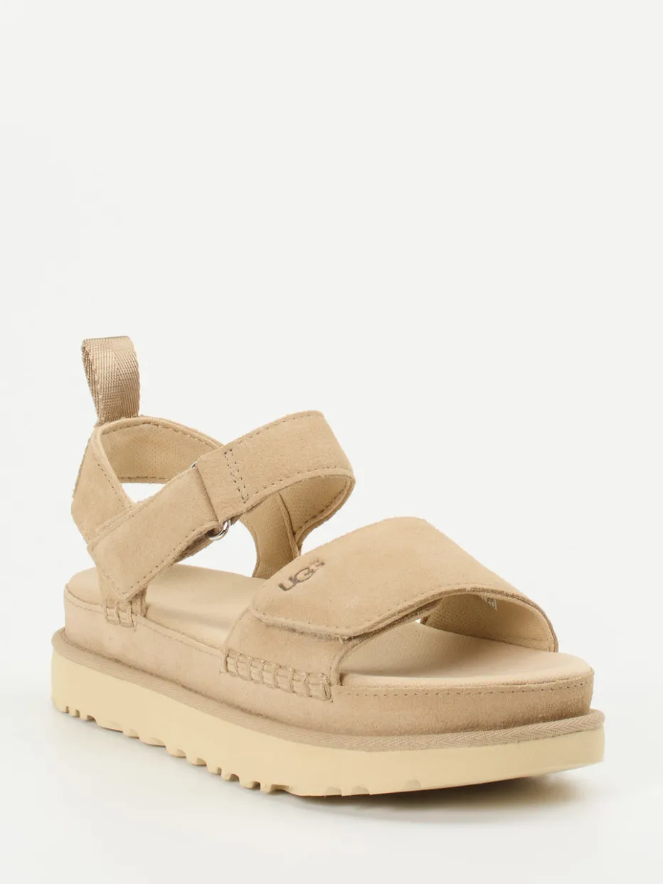 Wenn luftiger Tragekomfort und zuverlässiger Halt gefragt sind, zeigt sich diese UGG-Sandale als ideale Wahl. Das beigefarbene Veloursleder ist samtig weich angeschliffen und wird innen durch ein atmungsaktives Textilfutter ergänzt. Zwei breite Riemen mit Klettverschlüssen sorgen für eine individuell regulierbare Passform. Die offene und robuste Silhouette wird durch eine griffig profilierte Gummisohle ergänzt. Ton-in-Ton-Nähte und ein geprägtes Markenlogo fügen sich harmonisch ins minimalistische Design im Quiet Outdoor-Stil. Gut kombinierbar mit Leinen-Shorts oder leichten Sommerlooks.